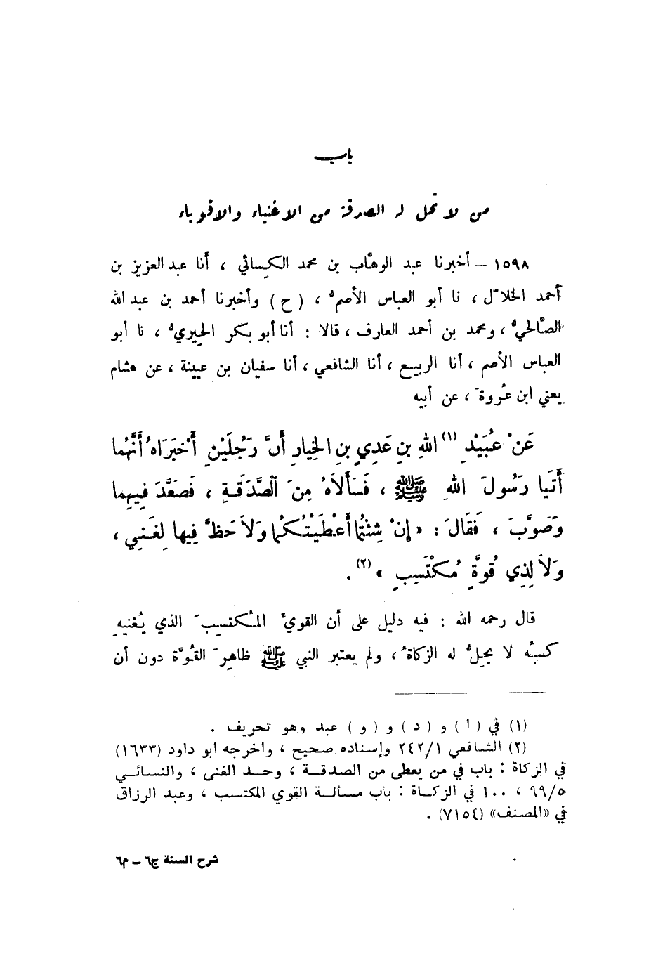 ح وَأَخْبَرَنَا أَحْمَدُ بْنُ عَبْدِ اللَّهِ الصَّالِحِيُّ، وَمُحَمَّدُ بْنُ أَحْمَدَ الْعَارِفُ، قَالا: أَنا أَبُو بَكْرٍ الْحِيرِيُّ، أَنا أَبُو الْعَبَّاسِ الْأَصَمُّ، أَنا الرَّبِيعُ، أَنا الشَّافِعِيُّ، أَنا سُفْيَانُ بْنُ عُيَيْنَةَ، عَنْ هِشَامٍ، يَعْنِي ابْنَ عُرْوَةَ، عَنْ أَبِيهِ، عَنْ عُبَيْدِ اللَّهِ بْنِ عَدِيِّ بْنِ الْخِيَارِ، أَنَّ رَجُلَيْنِ أَخْبَرَاهُ أَنَّهُمَا أَتَيَا رَسُولَ اللَّهِ صَلَّى اللهُ عَلَيْهِ وَسَلَّمَ، فَسَأَلاهُ مِنَ الصَّدَقَةِ، فَصَعَّدَ فِيهِمَا وَصَوَّبَ، فَقَالَ: «إِنْ شِئْتُمَا أَعْطَيْتُكُمَا وَلا حَظَّ فِيهَا لِغَنِيٍّ، وَلا لِذِي قُوَّةٍ مُكْتَسِبٍ»