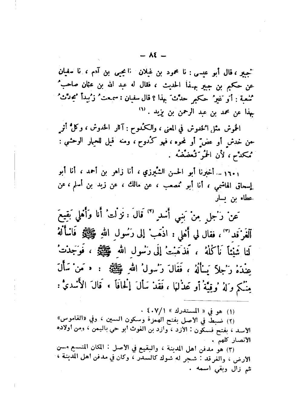 1601 - أَخْبَرَنَا أَبُو الْحَسَنِ الشِّيرزيُّ، أَنا زَاهِرُ بْنُ أَحْمَدَ، أَنا أَبُو إِسْحَاقَ الْهَاشِمِيُّ، أَنا أَبُو مُصْعَبٍ، عَنْ مَالِكٍ، عَنْ زَيْدِ بْنِ أَسْلَمَ، عَنْ عَطَاءِ بْنِ يَسَارٍ، عَنْ رَجُلٍ مِنْ بَنِي أَسْدٍ، قَالَ: نَزَلْتُ أَنَا وَأَهْلِي بَقِيعَ الْغَرْقَدِ، فَقَالَ لِي أَهْلِي: اذْهَبْ إِلَى رَسُولِ اللَّهِ صَلَّى اللهُ عَلَيْهِ وَسَلَّمَ، فَاسْأَلْهُ لَنَا شَيْئًا نَأكُلُهُ، فَذَهَبْتُ إِلَى رَسُولِ اللَّهِ صَلَّى اللهُ عَلَيْهِ وَسَلَّمَ، فَوَجَدْتُ عِنْدَهُ رَجُلا يَسْأَلُهُ، فَقَالَ رَسُولُ اللَّهِ صَلَّى اللهُ عَلَيْهِ وَسَلَّمَ: «مَنْ سَأَلَ مِنْكُمْ وَلَهُ وَقِيَّةٌ أَوْ عَدْلُهَا، فَقَدْ سَأَلَ إِلْحَافًا»، قَالَ الْأَسْدِيُّ: