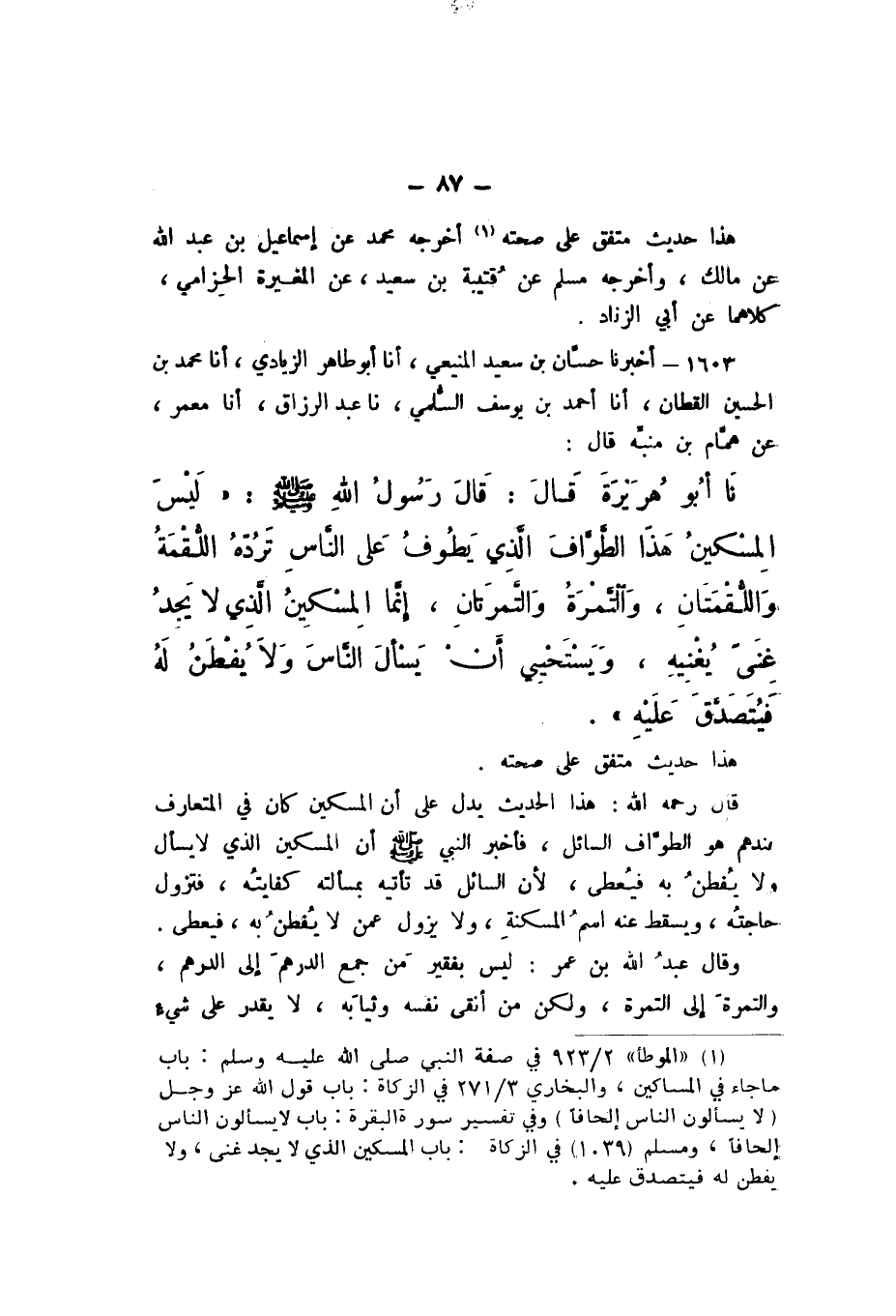 1603 - أَخْبَرَنَا حَسَّانُ بْنُ سَعِيدٍ الْمَنِيعِيُّ، أَنا أَبُو طَاهِرٍ الزِّيَادِيُّ، أَنا مُحَمَّدُ بْنُ الْحُسَيْنِ الْقَطَّانُ، أَنا أَحْمَدُ بْنُ يُوسُفَ السُّلَمِيُّ، نَا عَبْدُ الرَّزَّاقِ، أَنا مَعْمَرٌ، عَنْ هَمَّامِ بْنِ مُنَبِّهٍ، قَالَ: نَا أَبُو هُرَيْرَةَ، قَالَ: قَالَ رَسُولُ اللَّهِ صَلَّى اللهُ عَلَيْهِ وَسَلَّمَ: «لَيْسَ الْمِسْكِينُ هَذَا الطَّوَّافَ الَّذِي يَطُوفُ عَلى النَّاسِ، تَرُدُّهُ اللُّقْمَةُ وَاللُّقْمَتَانِ، وَالتَّمْرَةُ وَالتَّمْرَتَانِ، إِنَّمَا الْمِسْكِينُ الَّذِي لَا يَجِدُ غِنًى يُغْنِيهِ، وَيَسْتَحْيِي أَنْ يَسْأَلَ النَّاسَ، وَلا يُفْطَنُ لَهُ فَيتصدّق عَلَيْهِ».