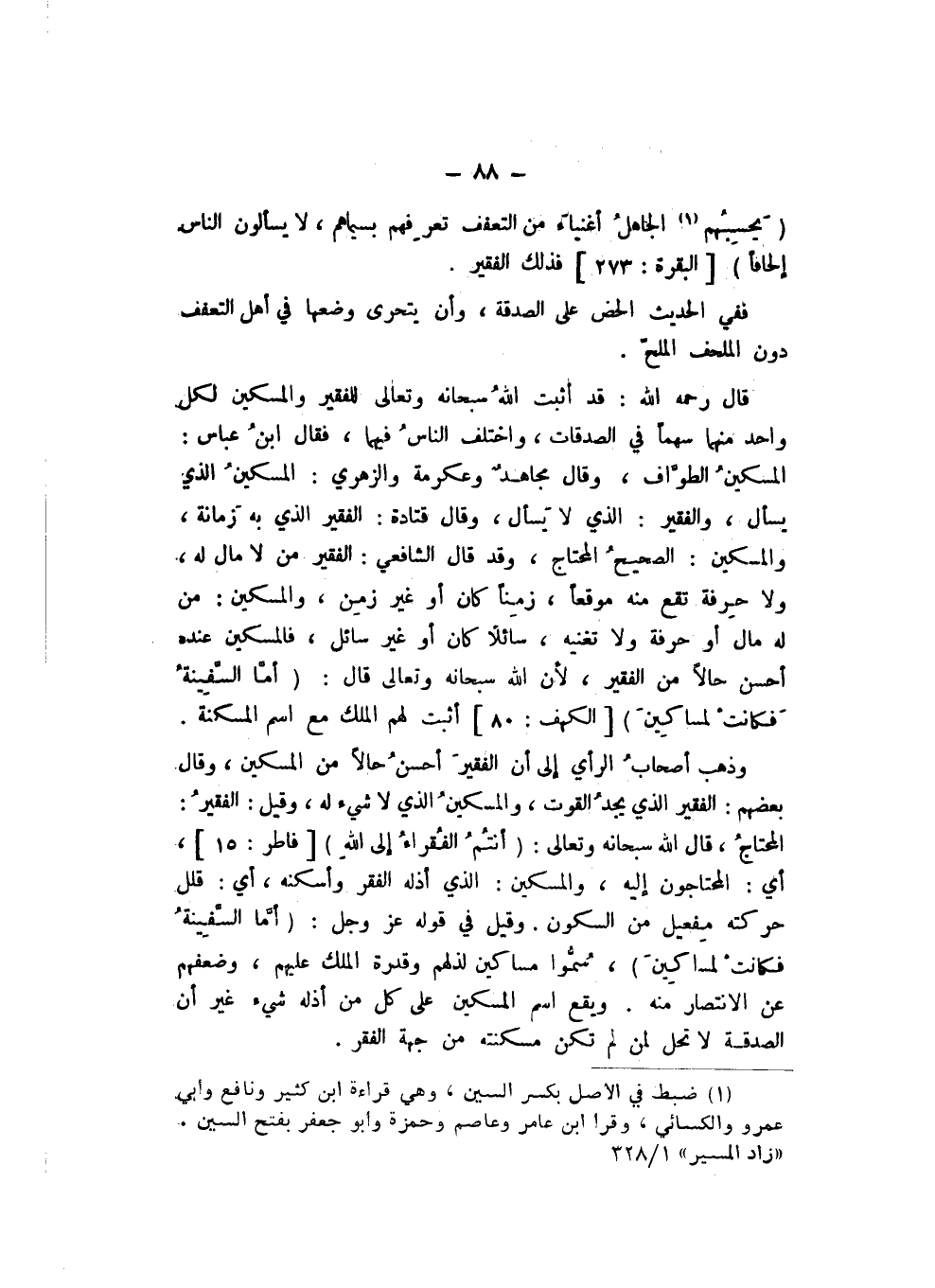 قَالَ رَحِمَهُ اللَّهُ: قَدْ أَثْبَتَ اللَّهُ سُبْحَانَهُ وَتَعَالَى لِلْفَقِيرِ وَالْمِسْكِينِ لِكُلِّ وَاحِدٍ مِنْهُمَا سَهْمًا فِي الصَّدَقَاتِ، وَاخْتَلَفَ النَّاسُ فِيهِمَا، فَقَالَ ابْنُ عَبَّاسٍ: الْمِسْكِينُ الطَّوَّافُ، وَقَالَ مُجَاهِدٌ، وَعِكْرِمَةُ، وَالزُّهْرِيُّ: الْمِسْكِينُ الَّذِي يَسْأَلُ، وَالْفَقِيرُ: الَّذِي لَا يَسْأَلُ، وَقَالَ قَتَادَةُ: الْفَقِيرُ الَّذِي بِهِ زَمَانَةٌ، وَالْمِسْكِينُ: الصَّحِيحُ الْمُحْتَاجُ، وَقَدْ قَالَ الشَّافِعِيُّ: الْفَقِيرُ مَنْ لَا مَالَ لَهُ، وَلا حِرْفَةَ تَقَعُ مِنْهُ مَوْقِعًا، زَمِنًا كَانَ أَوْ غَيْرَ زَمِنٍ، وَالْمِسْكِينُ: مَنْ لَهُ مَالٌ أَوْ حِرْفَةٌ وَلا تُغْنِيهِ، سَائِلا كَانَ أَوْ غَيْرَ سَائِلٍ، فَالْمِسْكِينُ عِنْدَهُ أَحْسَنُ حَالا مِنَ الْفَقِيرِ، لِأَنَّ اللَّهَ سُبْحَانَهُ وَتَعَالَى قَالَ: {أَمَّا السَّفِينَةُ فَكَانَتْ لِمَسَاكِينَ} [الْكَهْف: 79]، أَثْبَتَ لَهُمُ الْمُلْكَ مَعَ اسْمِ الْمَسْكَنَةِ.
