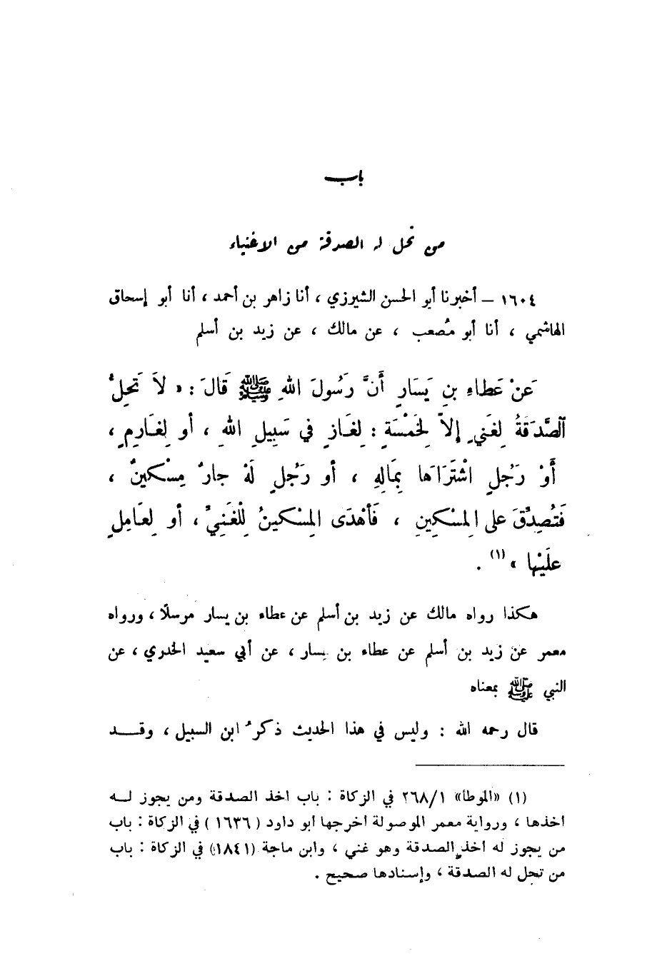1604 - أَخْبَرَنَا أَبُو الْحَسَنِ الشِّيرَزِيُّ، أَنا زَاهِرُ بْنُ أَحْمَدَ، أَنا أَبُو إِسْحَاقَ الْهَاشِمِيُّ، أَنا أَبُو مُصْعَبٍ، عَنْ مَالِكٍ، عَنْ زَيْدِ بْنِ أَسْلَمَ، عَنْ عَطَاءِ بْنِ يَسَارٍ، أَنّ رَسُولَ اللَّهِ صَلَّى اللهُ عَلَيْهِ وَسَلَّمَ، قَالَ: " لَا تَحِلُّ الصَّدَقَةُ لِغَنِيٍّ إِلا لِخَمْسَةٍ: لِغَازٍ فِي سَبِيلِ اللَّهِ، أَوْ لِغَارِمٍ، أَوْ رَجُلٍ اشْتَرَاهَا بِمَالِهِ، أَوْ رَجُلٍ لَهُ جَارٌ مِسْكينٌ، فَتُصُدِّقَ عَلَى الْمِسْكِينِ، فَأَهْدَى الْمِسْكِينُ لِلْغَنِيِّ، أَوْ لِعَامِلٍ عَلَيْهَا ".