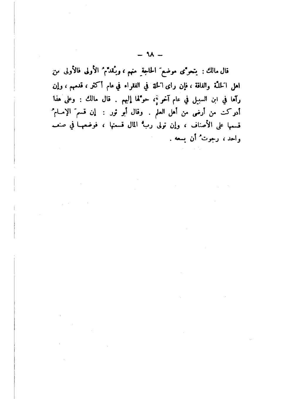 قَالَ مَالِكٌ: يَتَحَرَّى مَوْضِعَ الْحَاجَةِ مِنْهُمْ، وَيُقَدِّمُ الْأُولَى فَالْأُولَى مِنْ أَهْلِ الْخَلَّةِ وَالْفَاقَةِ، فَإِنْ رَأَى الْخَلَّةَ فِي الْفُقَرَاءِ فِي عَامٍ أَكْثَرَ، قَدَّمَهُمْ، وَإِنْ رَآهَا فِي ابْنِ السَّبِيلِ فِي عَامٍ آخَرَ، حَوَّلَهَا إِلَيْهِمْ.