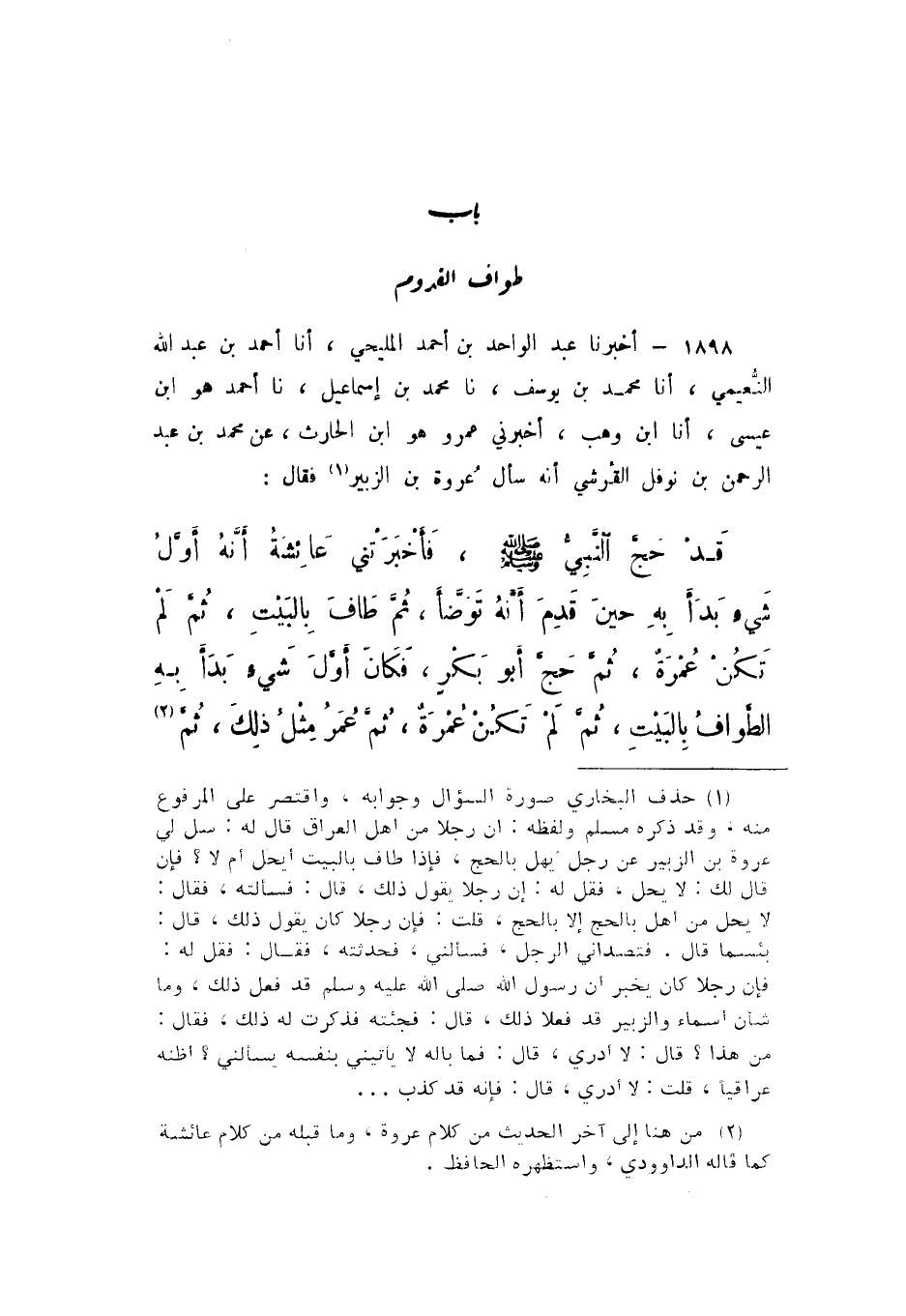 1898 - أَخْبَرَنَا عَبْدُ الْوَاحِدِ بْنُ أَحْمَدَ الْمَلِيحِيُّ، أَنا أَحْمَدُ بْنُ عَبْدِ اللَّهِ النُّعَيْمِيُّ، أَنا مُحَمَّدُ بْنُ يُوسُفَ، نَا مُحَمَّدُ بْنُ إِسْمَاعِيلَ، نَا أَحْمَدُ، هُوَ ابْنُ عِيسَى، أَنا ابْنُ وَهْبٍ، أَخْبَرَنِي عَمْرٌو، هُوَ ابْنُ الْحَارِثِ، عَنْ مُحَمَّدِ بْنِ عَبْدِ الرَّحْمَنِ بْنِ نَوْفَلٍ الْقُرَشِيِّ، أَنَّهُ سَأَلَ عُرْوَةَ بْنَ الزُّبَيْرِ، فَقَالَ: قَدْ حَجَّ النَّبِيُّ صَلَّى اللهُ عَلَيْهِ وَسَلَّمَ، فَأَخْبَرَتْنِي عَائِشَةُ أَنَّهُ أَوَّلُ شَيْءٍ بَدَأَ بِهِ حِينَ قَدِمَ «أَنَّهُ تَوَضَّأَ، ثُمَّ طَافَ بِالْبَيْتِ، ثُمَّ لَمْ تَكُنْ عُمْرَةٌ، ثُمَّ حَجَّ أَبُو بَكْرٍ، فَكَانَ أَوَّلَ شَيْءٍ بَدَأَ بِهِ الطَّوَافُ بِالْبَيْتِ، ثُمَّ لَمْ تَكُنْ عُمْرَةً، ثُمَّ عُمَرُ مِثْلُ ذَلِكَ، ثُمَّ