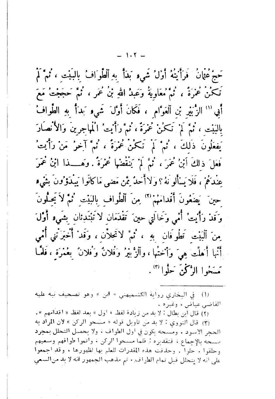 حَجَّ عُثْمَانُ، فَرَأَيْتُهُ أَوَّلُ شَيْءٍ بَدَأَ بِهِ الطَّوَافُ بِالْبَيْتِ، ثُمَّ لَمْ تَكُنْ عُمْرَةً، ثُمَّ مُعَاوِيةُ، وعَبْدُ اللَّهِ بْنُ عُمَرَ، ثُمَّ حَجَجْتُ مَعَ أَبِي الزُّبَيْرِ بْنِ الْعَوَّامِ، فَكَانَ أَوَّلَ شَيْءٍ بَدَأ بِهِ الطَّوَافُ بِالْبَيْتِ، ثُمَّ لَمْ تَكُنْ عُمْرَةً، ثُمَّ رَأَيْتُ الْمُهَاجِرِينَ وَالْأَنْصَارَ يَفعَلُونَ ذَلِكَ، ثُمَّ لَمْ تَكُنْ عُمْرةً، ثُمَّ آخِرُ مَنْ رَأَيْتُ فَعَلَ ذَلِكَ ابْنُ عُمَرَ، ثُمَّ لَمْ يَنْقُضْهَا عُمْرَةٌ، وَهَذَا ابْنُ عُمَرَ عِنْدَهُمْ، فَلا يَسْأَلُونَهُ؟ وَلا أَحَدٌ مِمَّنْ مَضَى مَا كَانُوا يَبْدَءُونَ بِشَيْءٍ حِينَ يَضَعُونَ أَقْدَامَهُمْ مِنَ الطَّوَافِ بِالْبَيْتِ، ثُمَّ لَا يَحِلُّونَ، وَقَدْ رَأَيْتُ أُمِّي وَخَالَتِي حِينَ تَقْدَمَانِ لَا تَبْتَدِئَانِ بِشَيْءٍ أَوَّلَ مِنَ الْبَيْتِ، تَطُوفَانِ بِهِ، ثُمَّ لَا تَحِلانِ، وَقَدْ أَخْبَرَتْنِي أُمِّي أَنَّهَا أَهَلَّتْ هِيَ وَأُخْتُهَا، وَالزُّبَيْرُ، وَفُلانٌ، وَفُلانٌ بِعُمْرَةٍ، فَلَمَّا مَسَحُوا الرُّكْنَ حَلُّوا».