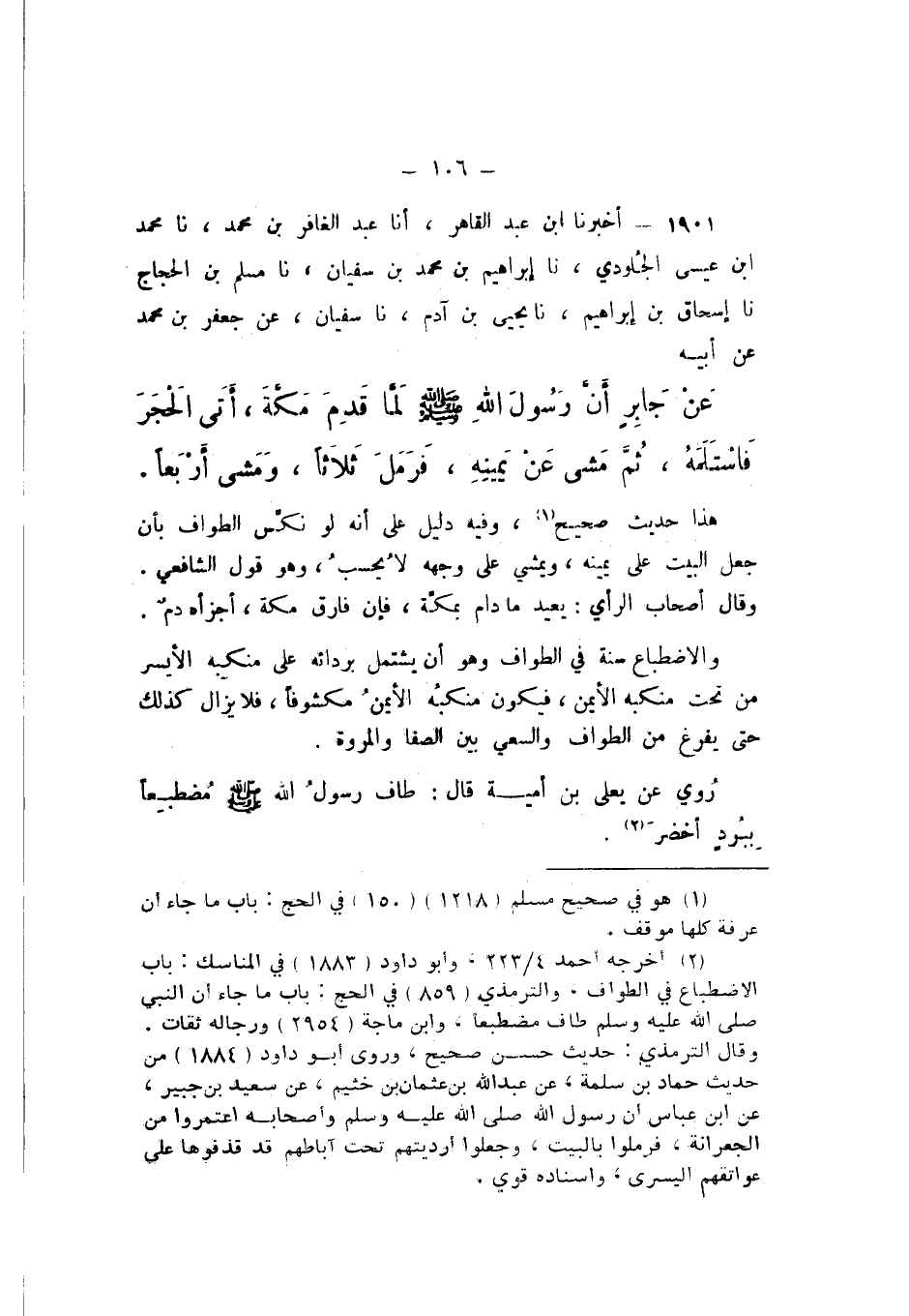 1901 - أَخْبَرَنَا ابْنُ عَبْدِ الْقَاهِرِ، أَنا عَبْدُ الْغَافِرِ بْنُ مُحَمَّدٍ، نَا مُحَمَّدُ بْنُ عِيسَى الْجُلُودِيُّ، نَا إِبْرَاهِيمُ بْنُ مُحَمَّدِ بْنِ سُفْيَانَ، نَا مُسْلِمُ بْنُ الْحَجَّاجِ، نَا إِسْحَاقُ بْنُ إِبْرَاهِيمَ، نَا يَحْيَى بْنُ آدَمَ، نَا سُفْيَانُ، عَنْ جَعْفَرِ بْنِ مُحَمَّدٍ، عَنْ أَبِيهِ، عَنْ جَابِرٍ، «أَنَّ رَسُولَ صَلَّى اللهُ عَلَيْهِ وَسَلَّمَ» لَمَّا قَدِمَ مَكَّةَ، أَتَى الْحَجَرَ فَاسْتَلَمَهُ، ثُمَّ مَشَى عَنْ يَميِنِهِ، فَرَمَلَ ثَلاثًا، وَمَشَى أَرْبَعًا ".