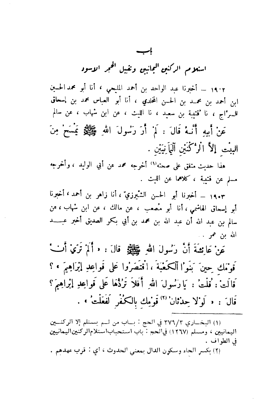 1902 - أَخْبَرَنَا عَبْدُ الْوَاحِدِ بْنُ أَحْمَدَ الْمَلِيحِيُّ، أَنا أَبُو مُحَمَّدٍ الْحُسَيْنُ بْنُ أَحْمَدَ بْنِ مُحَمَّدِ بْنِ الْحَسَنِ الْمَخْلَدِيُّ، أَنا أَبُو الْعَبَّاسِ مُحَمَّدُ بْنُ إِسْحَاقَ السَّرَّاجُ، نَا قُتَيْبَةُ بْنُ سَعِيدٍ، نَا اللَّيْثُ، عَنِ ابْنِ شِهَابٍ، عَنْ سَالِمٍ، عَنْ أَبِيهِ، أَنَّهُ قَالَ: «لَمْ أَرَ رَسُولَ اللَّهِ صَلَّى اللهُ عَلَيْهِ وَسَلَّمَ يَمْسَحُ مِنَ الْبَيْتِ إِلا الرُّكْنَيْنِ الْيَمَانِيَّيْنِ».