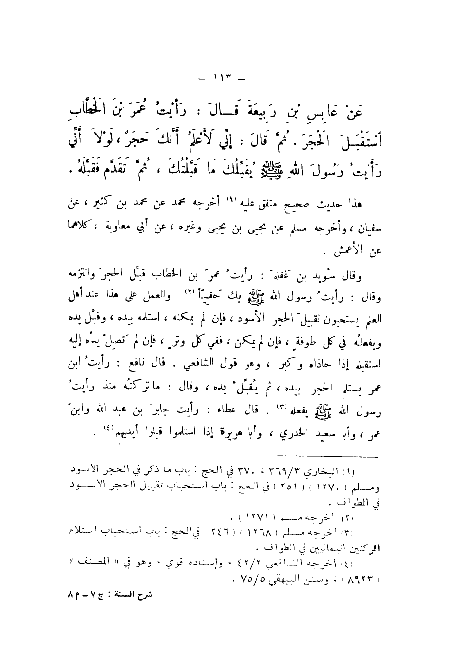 عَنْ عَابِسِ بْنِ رَبِيعَةَ، قَالَ: رَأَيْتُ عُمَرَ بْنَ الْخَطَّابِ اسْتَقْبَلَ الْحَجَرَ، ثُمَّ قَالَ: «إِنِّي لَأَعْلَمُ أَنَّكَ حَجَرٌ، لَوْلا أَنِّي رَأَيْتُ رَسُولَ اللَّهِ صَلَّى اللهُ عَلَيْهِ وَسَلَّمَ يُقَبِّلُكَ مَا قَبَّلْتُكَ، ثُمَّ تَقَدَّمَ فَقَبَّلَهُ».