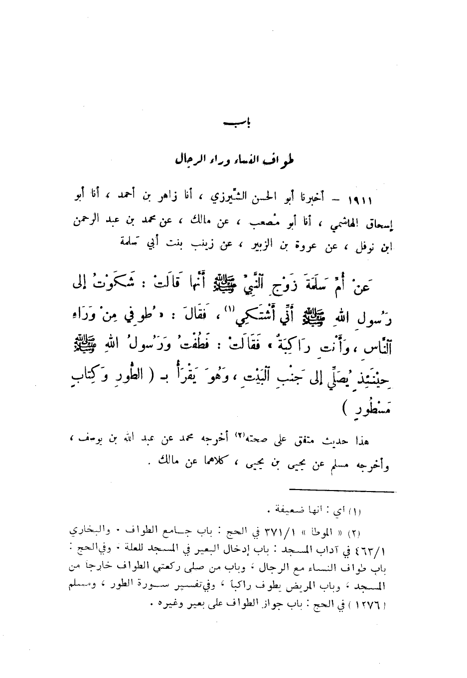 1911 - أَخْبَرَنَا أَبُو الْحَسَنِ الشِّيرَزِيُّ، أَنا زَاهِرُ بْنُ أَحْمَدَ، أَنا أَبُو إِسْحَاقَ الْهَاشِمِيُّ، أَنا أَبُو مُصْعَبٍ، عَنْ مَالِكٍ، عَنْ مُحَمَّدِ بْنِ عَبْدِ الرَّحْمَنِ بْنِ نَوْفَلٍ، عَنْ عُرْوَةَ بْنِ الزُّبَيْرِ، عَنْ زَيْنَبَ بِنْتِ أَبِي سَلَمَةَ، عَنْ أُمِّ سَلَمَةَ زَوْجِ النَّبِيِّ صَلَّى اللهُ عَلَيْهِ وَسَلَّمَ، أَنَّهَا قَالَتْ: شَكَوْتُ إِلَى رَسُولِ اللَّهِ صَلَّى اللهُ عَلَيْهِ وَسَلَّمَ أَنِّي أَشْتَكِي، فَقَالَ: «طُوفِي مِنْ وَرَاءِ النَّاسِ، وَأَنْتِ رَاكِبَةٌ»، فَقَالَتْ: فَطُفْتُ وَرَسُولُ اللَّهِ صَلَّى اللهُ عَلَيْهِ وَسَلَّمَ حِينَئِذٍ يُصَلِّي إِلَى جَنْبِ الْبَيْتِ، وَهُوَ يَقْرَأُ بِـ الطُّورِ وَكِتَابٍ مَسْطُورٍ ".