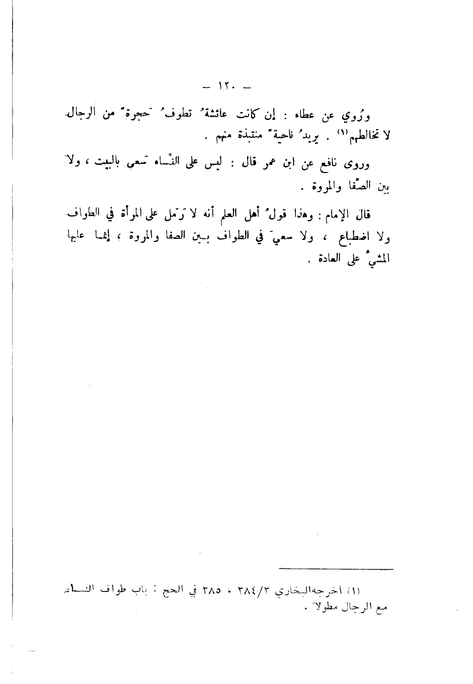 قَالَ الإِمَامُ: وَهَذَا قَوْلُ أَهْلِ الْعِلْمِ أَنَّهُ لَا رَمَلَ عَلَى الْمَرْأَةِ فِي الطَّوَافِ، وَلا اضْطِبَاعَ، وَلا سَعْيَ فِي الطَّوَافِ بَيْنَ الصَّفَا وَالْمَرْوَةِ، إِنَّمَا عَلَيْهَا الْمَشْيُ عَلَى الْعَادَةِ.