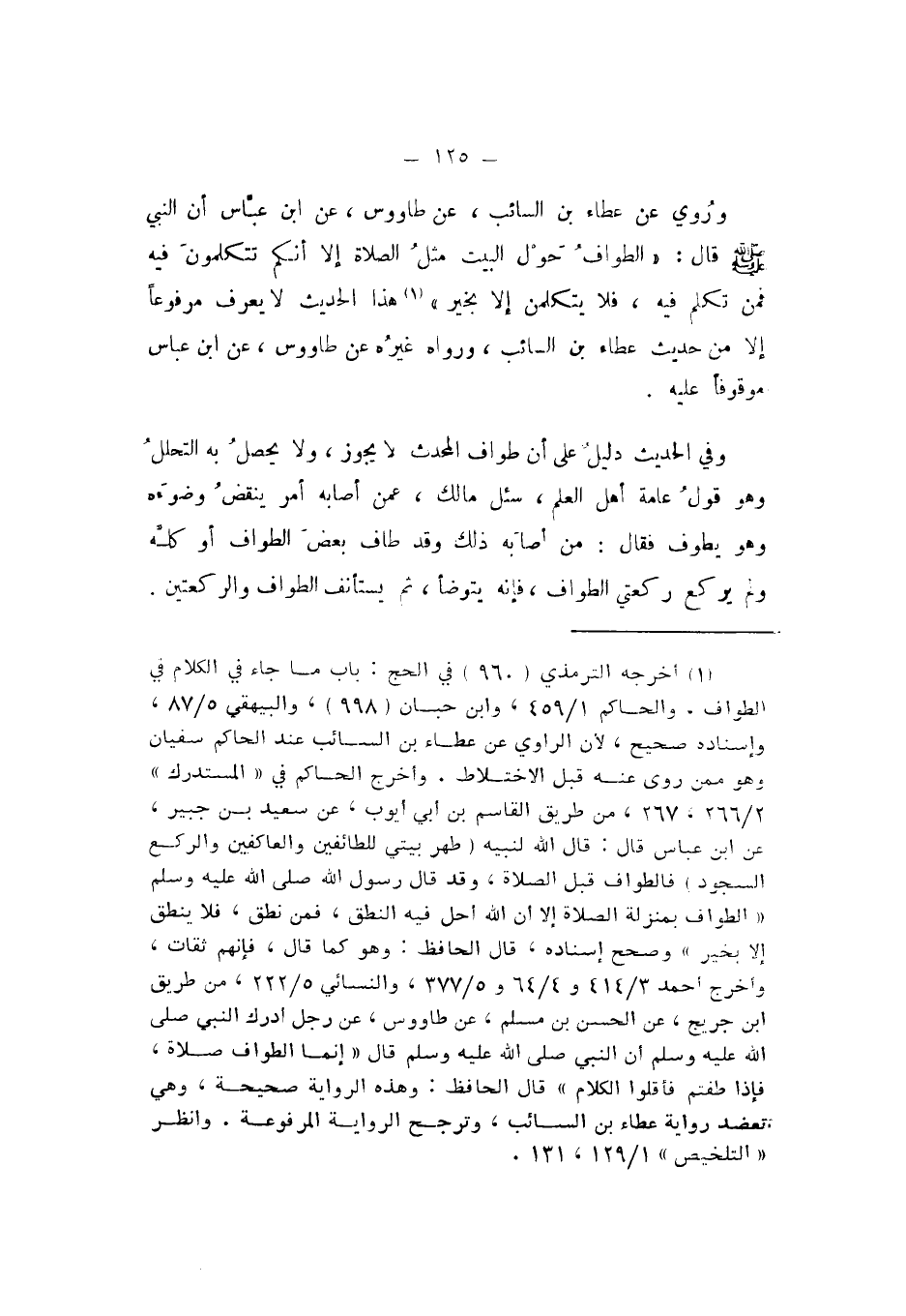 وَرُوِيَ عَنْ عَطَاءِ بْنِ السَّائِبِ، عَنْ طَاوُسٍ، عَنِ ابْنِ عَبَّاسٍ، أَنَّ النَّبِيَّ صَلَّى اللهُ عَلَيْهِ وَسَلَّمَ، قَالَ: «الطَّوَافُ حَوْلَ الْبَيْتِ مِثْلُ الصَّلاةِ إِلا أَنَّكُمْ تَتَكَلَّمُونَ فِيهِ فَمَنْ تَكَلَّمَ فِيهِ، فَلا يَتَكَلَّمَنَّ إِلا بِخَيْرٍ».