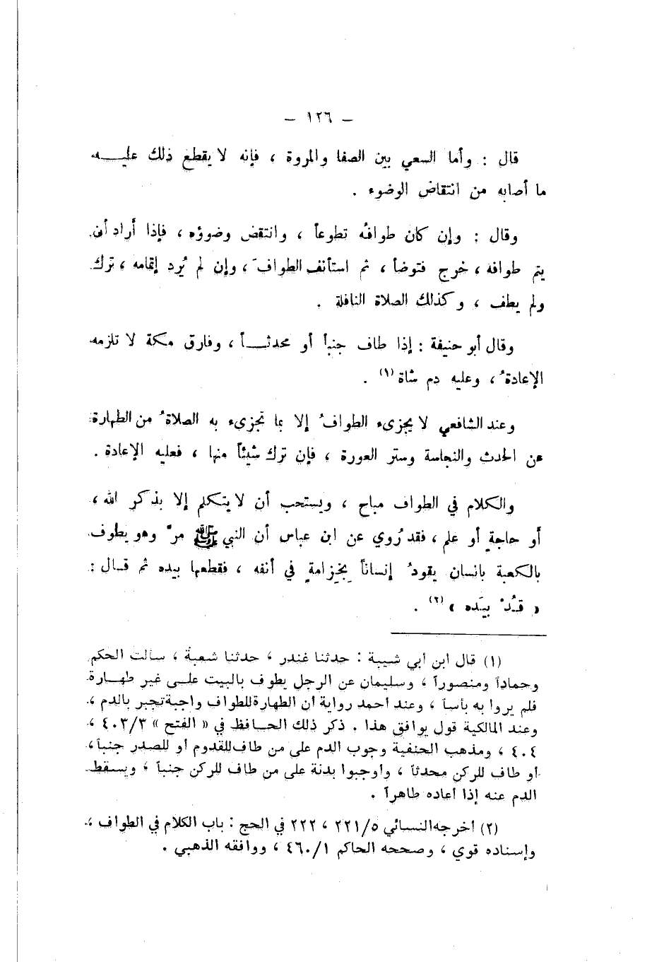 وَالْكَلامُ فِي الطَّوَافِ مُبَاحٌ، وَيُسْتَحَبُّ أَنْ لَا يَتَكَلَّمَ إِلا بِذِكْرِ اللَّهِ، أَوْ حَاجَةٍ، أَوْ عِلْمٍ، فَقَدْ رُوِيَ عَنِ ابْنِ عَبَّاسٍ، أَنَّ النَّبِيَّ صَلَّى اللهُ عَلَيْهِ وَسَلَّمَ " مَرَّ وَهُوَ يَطُوفُ بِالْكَعْبَةِ بِإِنْسَانٍ يَقُودُ إِنْسَانًا بِخِزَامَةٍ فِي أَنْفِهِ، فَقَطَعَهُمَا بِيَدِهِ، ثُمَّ قَالَ: قُدْ بِيَدِهِ.