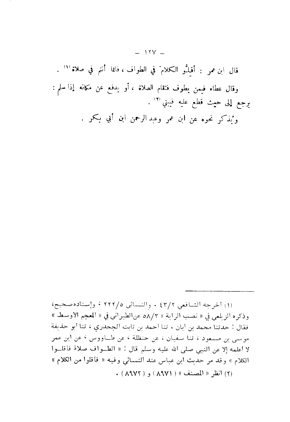قَالَ ابْنُ عُمَرَ: أَقِلُّوا الْكَلامَ فِي الطَّوَافِ، فَإِنَّمَا أَنْتُمْ فِي صَلاةٍ.