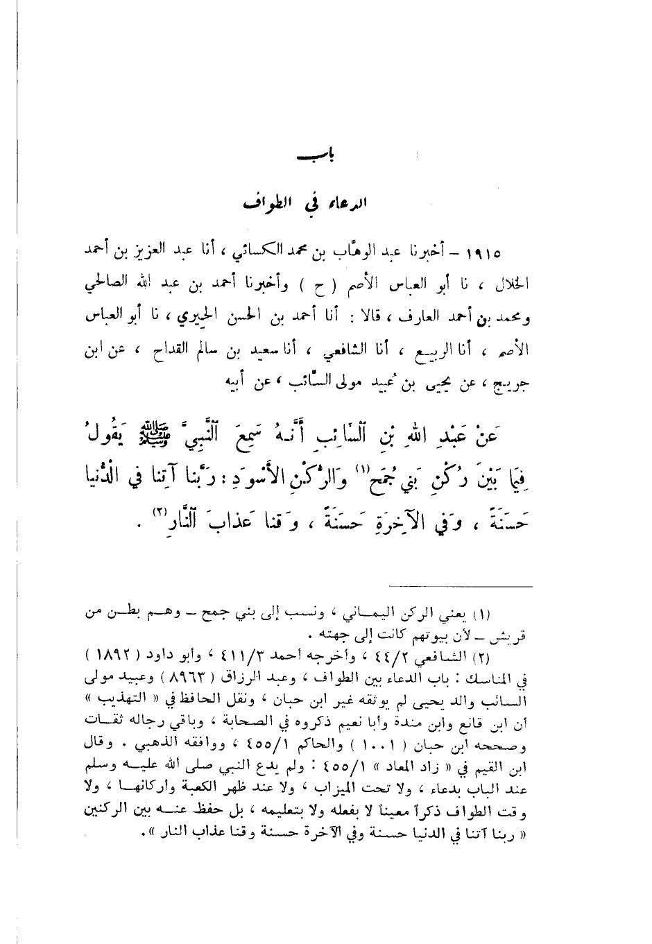 حَ وَأَخْبَرَنَا أَحْمَدُ عَبْدُ اللَّهِ الصَّالِحِيُّ، وَمُحَمَّدُ بْنُ أَحْمَدَ الْعَارِفُ، قَالا: أَنا أَحْمَدُ بْنُ الْحَسَنِ الْحِيرِيُّ، نَا أَبُو الْعَبَّاسِ الْأَصَمُّ، أَنا الرَّبِيعُ، أَنا الشَّافِعِيُّ، أَنا سَعِيدُ بْنُ سَالِمٍ الْقَدَّاحُ، عَنِ ابْنِ جُرَيْجٍ، عَنْ يَحْيَى بْنِ عُبَيْدٍ، مَوْلَى السَّائِبِ، عَنْ أَبِيهِ، عَنْ عَبْدِ اللَّهِ بْنِ السَّائِبِ، أَنَّهُ سَمِعَ النَّبِيَّ صَلَّى اللهُ عَلَيْهِ وَسَلَّمَ، يَقُولُ فِيمَا بَيْنَ رُكْنِ بَنِي جُمَحٍ وَالُّركْنِ الْأَسْوَدِ: «رَبَّنَا آتِنَا فِي الدُّنْيَا حَسَنَةً، وَفِي الْآخِرَةِ حَسَنَةً، وَقِنَا عَذَابَ النَّارِ»