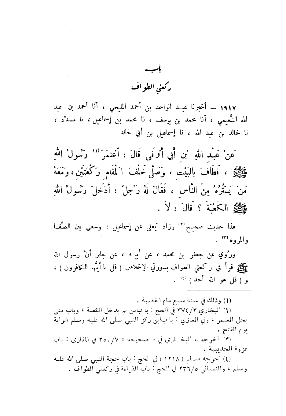 1917 - أَخْبَرَنَا عَبْدُ الْوَاحِدِ بْنُ أَحْمَدَ الْمَلِيحِيُّ، أَنا أَحْمَدُ بْنُ عَبْدِ اللَّهِ النُّعَيْمِيُّ، أَنا مُحَمَّدُ بْنُ يُوسُفَ، نَا مُحَمَّدُ بْنُ إِسْمَاعِيلَ، نَا مُسَدَّدٌ، نَا خَالِدُ بْنُ عَبْدِ اللَّهِ، نَا إِسْمَاعِيلُ بْنُ أَبِي خَالِدٍ، عَنْ عَبْدِ اللَّهِ بْنِ أَبِي أَوْفَى، قَالَ: " اعْتَمَرَ رَسُولُ اللَّهِ صَلَّى اللهُ عَلَيْهِ وَسَلَّمَ، فَطَافَ بِالْبَيْتِ، وَصَلَّى خَلْفَ الْمَقَامِ رَكْعَتَيْنِ، وَمَعَهُ مَنْ يَسْتُرُهُ مِنَ النَّاسِ، فَقَالَ لَهُ رَجُلٌ: أَدَخَلَ رَسُولُ اللَّهِ صَلَّى اللهُ عَلَيْهِ وَسَلَّمَ الْكَعْبَةَ؟ قَالَ: لَا ".
