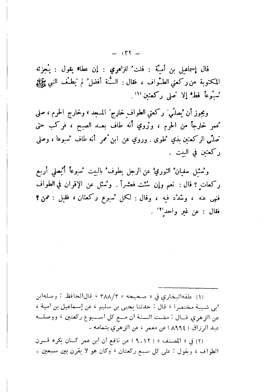 قَالَ إِسْمَاعِيلُ بْنُ أُمَيَّةَ: قُلْتُ لِلزُّهْرِيِّ: إِنَّ عَطَاءً، يَقُولُ: يُجْزِئُهُ الْمَكْتُوبَةُ مِنْ رَكْعَتَيِ الطَّوَافِ، فَقَالَ: السُّنَّةُ أَفْضَلُ، لَمْ يَطُفِ النَّبِيُّ صَلَّى اللهُ عَلَيْهِ وَسَلَّمَ سُبُوعًا قَطُّ إِلا صَلَّى رَكْعَتَيْنِ.