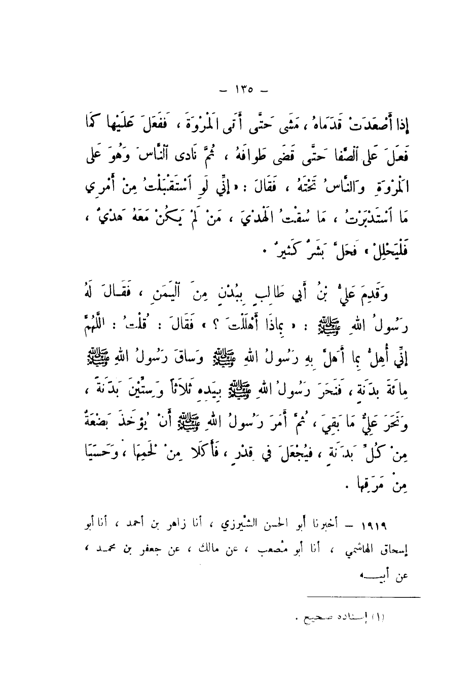 وَقَدِمَ عَلِيُّ بْنُ أَبِي طَالِبٍ بِبُدْنٍ مِنَ الْيَمَنِ، فَقَالَ لَهُ رَسُولُ اللَّهِ صَلَّى اللهُ عَلَيْهِ وَسَلَّمَ: «بِمَاذَا أَهْلَلْتَ؟» فَقَالَ: قُلْتُ: اللَّهُمَّ إِنِّي أُهِلُّ بِمَا أَهَلَّ بِهِ رَسُولُ اللَّهِ صَلَّى اللهُ عَلَيْهِ وَسَلَّمَ، وَسَاقَ رَسُولُ اللَّهِ صَلَّى اللهُ عَلَيْهِ وَسَلَّمَ مِائَةَ بَدَنَةٍ، فَنَحَرَ رَسُولُ اللَّهِ صَلَّى اللهُ عَلَيْهِ وَسَلَّمَ بِيَدِهِ ثَلاثًا وَسِتِّينَ بَدَنَةً، وَنَحَرَ عَلِيٌّ مَا بَقِيَ، ثُمَّ أَمَرَ رَسُولُ اللَّهِ صَلَّى اللهُ عَلَيْهِ وَسَلَّمَ أَنْ يُؤخَذَ بَضْعَةٌ مِنْ كُلِّ بَدَنةٍ، فيُجْعَلَ فِي قِدْرٍ، فَأَكَلا مِنْ لَحْمِهَا، وَحَسَيَا مِنْ مَرَقِهَا ".