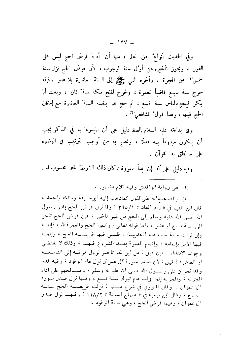 وَفِي الْحَدِيثِ أَنْوَاعٌ مِنَ الْعِلْمِ، مِنْهَا أَنَّ أَدَاءَ فَرْضِ الْحَجِّ لَيْسَ عَلَى الْفَوْرِ، وَيَجُوزُ تَأْخِيرُهُ عَنْ أَوَّلِ سَنَةِ الْوُجُوبِ، لِأَنَّ فَرْضَ الْحَجِّ نَزَلَ سَنَةَ خَمْسٍ مِنَ الْهِجْرَةِ، وَأَخَّرَهُ النَّبِيُّ صَلَّى اللهُ عَلَيْهِ وَسَلَّمَ إِلَى السَّنَةِ الْعَاشِرَةِ بِلا عُذْرٍ، فَإِنَّهُ خَرَجَ سَنَةَ سَبْعٍ قَاضِيًا لِلْعُمْرَةِ، وَخَرَجَ لِفَتْحِ مَكَّةَ سَنَةَ ثَمَانٍ، وَبَعَثَ أَبَا بَكْرٍ لِيَحُجَّ بِالنَّاسِ سَنَةَ تِسْعٍ، ثُمَّ حَدَّثَنَا هُوَ بِنَفْسِهِ السَّنَةَ الْعَاشِرَةَ مَعَ إِمْكَانِ الْحَجِّ قَبْلَهَا، وَهَذَا قَوْلُ الشَّافِعِيِّ.