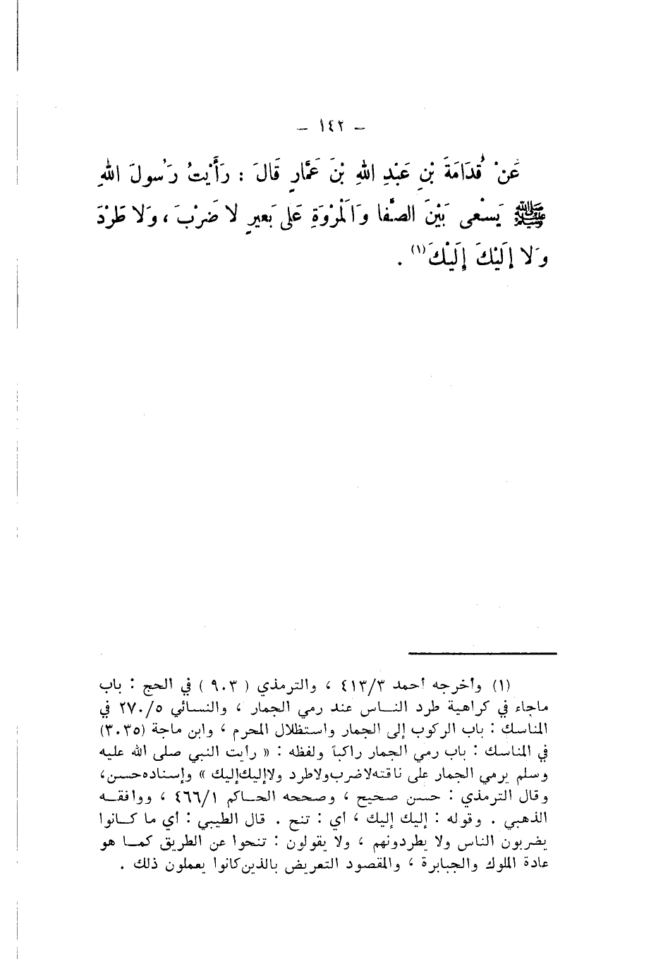عَنْ قُدَامَةَ بْنِ عَبْدِ اللَّهِ بْنِ عَمَّارٍ، قَالَ: رَأَيْتُ رَسُولَ اللَّهِ صَلَّى اللهُ عَلَيْهِ وَسَلَّمَ يَسْعَى بَيْنَ الصَّفَا وَالْمَرْوَةِ عَلَى بَعِيرٍ لَا ضَرْبَ، وَلا طَرْدَ، وَلا إِلَيْكَ إِلَيْكَ.