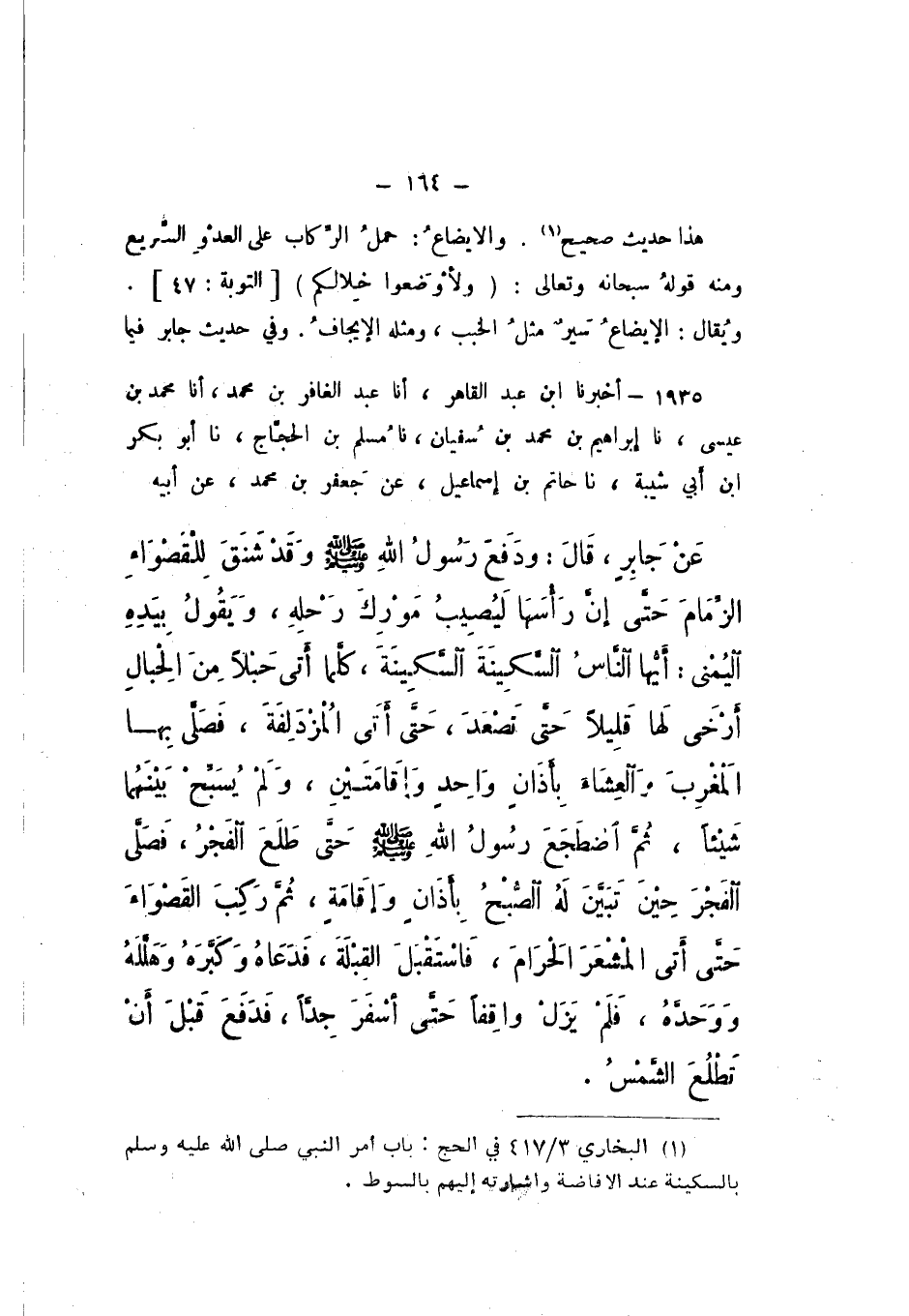 1935 - أَخْبَرَنَا ابْنُ عَبْدِ الْقَاهِرِ، أَنا عَبْدُ الْغَافِرِ بْنُ مُحَمَّدٍ، أَنا مُحَمَّدُ بْنُ عِيسَى، نَا إِبْرَاهِيمُ بْنُ مُحَمَّدِ بْنِ سُفْيَانَ، نَا مُسْلِمُ بْنُ الْحَجَّاجِ، نَا أَبُو بَكْرِ بْنُ أَبِي شَيْبَةَ، نَا حَاتِمُ بْنُ إِسْمَاعِيلَ، عَنْ جَعْفَرِ بْنِ مُحَمَّدٍ، عَنْ أَبِيهِ، عَنْ جَابِرٍ، قَالَ: " وَدَفَعَ رَسُولُ اللَّهِ صَلَّى اللهُ عَلَيْهِ وَسَلَّمَ، وَقَدْ شَنَقَ لِلْقَصْوَاءِ الزِّمَامَ، حتَّى إِنَّ رَأْسَهَا لَيُصِيبُ مَوْرِكَ رَحْلِهِ، وَيَقُولُ بِيَدِهِ الْيُمْنَى: أَيُّها النَّاسُ، السَّكِينَةَ السَّكِينَةَ، كُلَّمَا أَتَى حَبْلا مِنَ الْحِبَالِ أَرْخَى لَهَا قَلِيلا حَتَّى تَصْعَدَ، حَتَّى أَتَى الْمُزْدَلِفَةَ، فَصَلَّى بِهَا الْمَغْرِبَ وَالْعِشَاءَ بِأَذَانٍ وَاحِدٍ وَإِقَامَتَيْنِ، وَلَمْ يُسَبِّحْ بَيْنَهُمَا شَيْئًا، ثُمَّ اضْطَجَعَ رَسُولُ اللَّهِ صَلَّى اللهُ عَلَيْهِ وَسَلَّمَ حتَّى طَلَعَ الْفَجْرُ، فَصَلَّى الْفَجْرَ حِينَ تبَيَّنَ لَهُ الصُّبْحُ بِأَذَانٍ وَإقَامَةٍ، ثُمَّ رَكِبَ الْقَصْوَاءَ حَتَّى أَتَى الْمَشْعَرَ الْحَرَامَ، فَاسْتَقْبَلَ الْقِبْلَةَ، فَدَعَاهُ، وَكَبَّرَهُ، وَهَلَّلَهُ، وَوَحَدَّهُ، فَلَمْ يَزَلْ وَاقِفًا حَتَّى أسْفَرَ جدا، فَدَفَعَ قَبْلَ أَنْ تَطْلُعَ الشَّمْسُ ".