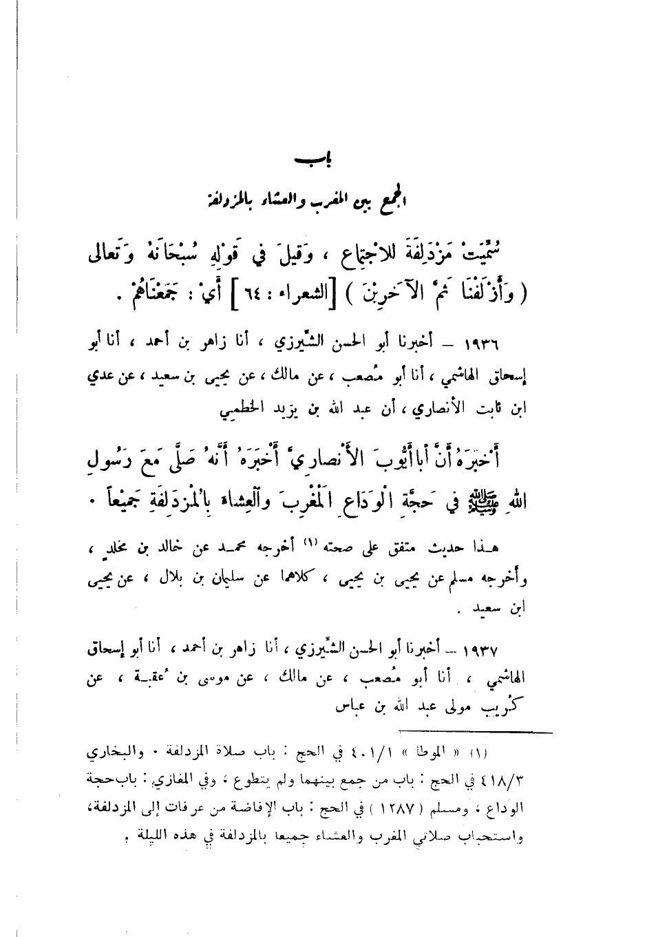 1936 - أَخْبَرَنَا أَبُو الْحَسَنِ الشِّيرَزِيُّ، أَنا زَاهِرُ بْنُ أَحْمَدَ، أَنا أَبُو إِسْحَاقَ الْهَاشِمِيُّ، أَنا أَبُو مُصْعَبٍ، عَنْ مَالِكٍ، عَنْ يَحْيَى بْنِ سَعِيدٍ، عَنْ عَدِيِّ بْنِ ثَابِتٍ الْأَنْصَارِيِّ، أَنَّ عَبْدَ اللَّهِ بْنَ يَزِيدَ الْخَطْمِيَّ، أَخْبَرَهُ أَنَّ أَبَا أَيُّوبَ الْأَنْصَارِيَّ، أَخْبَرَهُ «أَنَّهُ صَلَّى مَعَ رَسُولِ اللَّهِ صَلَّى اللهُ عَلَيْهِ وَسَلَّمَ فِي حَجَّةِ الْوَدَاعِ الْمَغْرِبَ وَالْعِشَاءَ بِالْمُزْدَلِفَةِ جَمِيعًا».