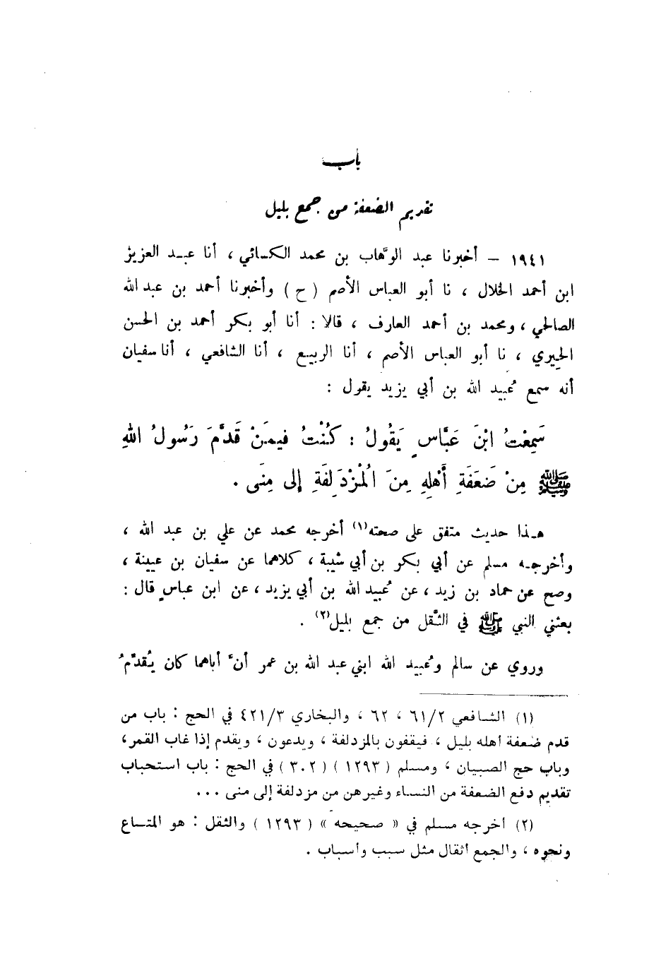 حَ وَأَخْبَرَنَا أَحْمَدُ بْنُ عَبْدِ اللَّهِ الصَّالِحِيُّ، وَمُحَمَّدُ بْنُ أَحْمَدَ الْعَارِفُ، قَالا: أَنا أَبُو بَكْرٍ أَحْمَدُ بْنُ الْحَسَنِ الْحِيرِيُّ، نَا أَبُو الْعَبَّاسِ الأَصَمُّ، أَنا الرَّبِيعُ، أَنا الشَّافِعِيُّ، أَنا سُفْيَانُ، أَنَّهُ سَمِعَ عُبَيْدَ اللَّهِ بْنَ أَبِي يَزِيدَ، يَقُولُ: سَمِعْتُ ابْنَ عَبَّاسٍ، يَقُولُ: «كُنْتُ فِيمَنْ قَدَّمَ رَسُولُ اللَّهِ صَلَّى اللهُ عَلَيْهِ وَسَلَّمَ مِنْ ضَعَفَةِ أَهْلِهِ مِنَ الْمُزْدَلِفَةِ إِلَى مِنًى».