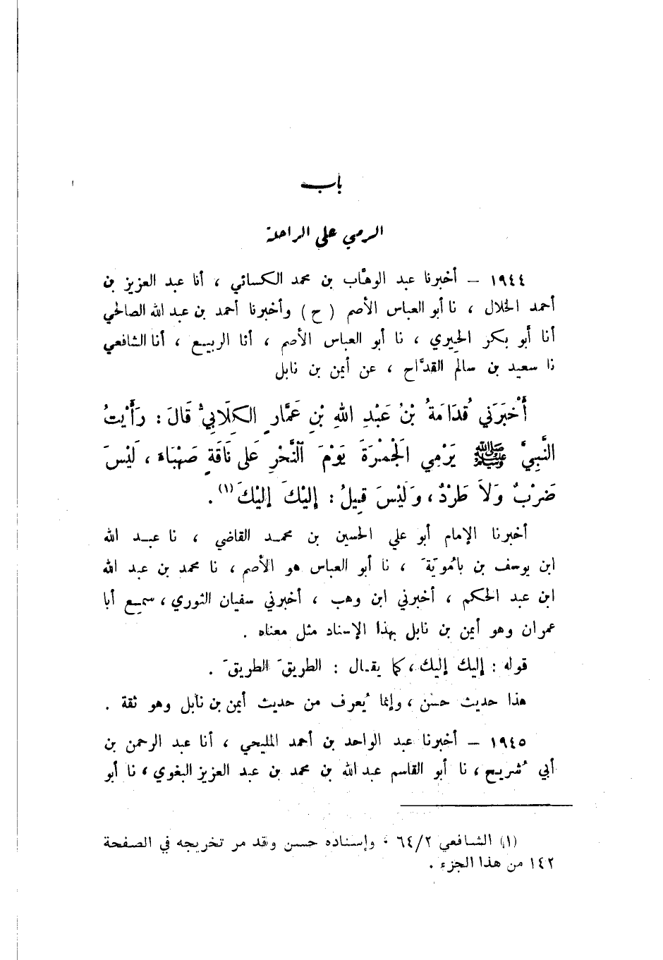 حَ وَأَخْبَرَنَا أَحْمَدُ بْنُ عَبْدِ اللَّهِ الصَّالِحِيُّ، أَنا أَبُو بَكْرٍ الْحِيرِيُّ، نَا أَبُو الْعَبَّاسِ الْأَصَمُّ، أَنا الرَّبِيعُ، أَنا الشَّافِعِيُّ، نَا سَعِيدُ بْنُ سَالِمٍ الْقَدَّاحُ، عَنْ أَيْمَنَ بْنِ نَابِلٍ، أَخْبَرَني قُدَامَةُ بْنُ عَبْدِ اللَّهِ بْنِ عَمَّارٍ الْكِلابِيُّ، قَالَ: رَأَيْتُ النَّبِيَّ صَلَّى اللهُ عَلَيْهِ وَسَلَّمَ " يَرْمِي الْجَمْرَةَ يَوْمَ النَّحْرِ عَلَى نَاقَةٍ صَهْبَاءَ، لَيْسَ ضَرْبٌ وَلا طَرْدٌ، وَلَيْسَ قِيلَ: إِلَيْكَ إِلَيْكَ ".