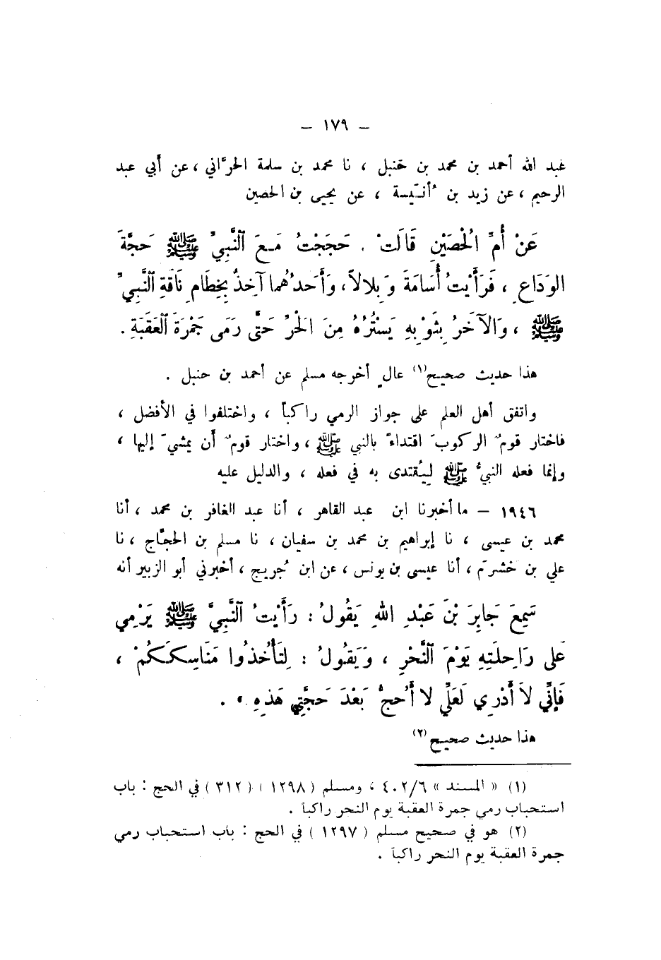 عَبْدِ اللَّهِ أَحْمَدُ بْنُ مُحَمَّدِ بْنِ حَنْبَلٍ، نَا مُحَمَّدُ بْنُ سَلَمَةَ الْحَرَّانِيُّ، عَنْ أَبِي عَبْدِ الرَّحِيمِ، عَنْ زَيْدِ بْنِ أُنَيْسَةَ، عَنْ يَحْيَى بْنِ الْحُصَيْنِ، عَنْ أُمِّ الْحُصَيْن، قَالَتْ: «حَجَجْتُ مَعَ النَّبِيِّ صَلَّى اللهُ عَلَيْهِ وَسَلَّمَ حَجَّةَ الْوَدَاعِ، فَرَأَيْتُ أُسَامَةَ، وَبِلالا، وَأَحَدُهُمَا آخِذٌ بِخِطَامِ نَاقَةِ النَّبِيِّ صَلَّى اللهُ عَلَيْهِ وَسَلَّمَ، وَالْآخَرُ بِثَوْبِهِ يَسْتُرُهُ مِنَ الْحَرِّ، حَتَّى رَمَى جَمْرَةَ الْعَقَبَةِ».