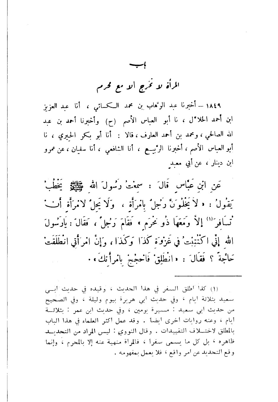 حَ وَأَخْبَرَنَا أَحْمَدُ بْنُ عَبْدِ اللَّهِ الصَّالِحِيُّ، وَمُحَمَّدُ بْنُ أَحْمَدَ الْعَارِفُ، قَالا: أَنا أَبُو بَكْرٍ الْحِيرِيُّ، نَا أَبُو الْعَبَّاسِ الْأَصَمُّ، أَخْبَرَنَا الرَّبِيعُ، أَنا الشَّافِعِيُّ، أَنا سُفْيَانُ، عَنْ عَمْرِو بْنِ دِينَارٍ، عَنْ أَبِي مَعْبَدٍ، عَنِ ابْنِ عَبَّاسٍ، قَالَ: سَمِعْتُ رَسُولَ اللَّهِ صَلَّى اللهُ عَلَيْهِ وَسَلَّمَ يَخْطُبُ يَقُولُ: «لَا يَخْلُوَنَّ رَجُلٌ بِامْرَأَةٍ، وَلا يَحِلُّ لامْرَأَةٍ أَنْ تُسَافِرَ إِلا وَمَعَهَا ذُو مَحْرَمٍ»، فَقَامَ رَجُلٌ، فَقَالَ: يَا رَسُولَ اللَّهِ، إِنِّي اكْتُتِبْتُ فِي غَزْوةِ كَذَا وَكَذَا، وَإِنَّ امْرَأَتِي انْطَلَقَتْ حَاجَّةً؟ فَقَالَ: «انْطَلِقْ فَاحْجُجْ بِامْرَأَتِكَ».