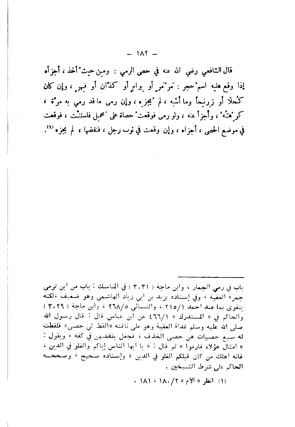 قَالَ الشَّافِعِيُّ رَضِيَ اللَّهُ عَنْهُ فِي حَصَى الرَّمْيِ: وَمِنْ حَيْثُ أَخَذَ، أَجْزَأَهُ إِذَا وَقَعَ عَلَيْهِ اسْمُ حَجَرٍ: مَرْمَرٍ، أَوْ بِرَامٍ، أَوْ كَذَّانٍ، أَوْ فِهْرٍ، وَإِنْ كَانَ كُحْلا، أَوْ زِرْنِيحًا، وَمَا أَشْبَهُ، لَمْ يُجْزِهِ، وَإِنْ رَمَى مَا قَدْ رُمِيَ بِهِ مَرَّةً، كَرِهْتُهُ، وَأَجْزَأَ عَنْهُ، وَلَوْ رَمَى فَوَقَعَتْ حَصَاةٌ عَلَى مَحْمَلٍ فَاسْتَنَتْ، فَوَقَعَتْ فِي مَوْضِعِ الْحَصَى، أَجْزَاهُ، وَإِنْ وَقَعَتْ فِي ثَوْبِ رَجُلٍ، فَنَفَضَهَا، لَمْ يُجْزِهِ.