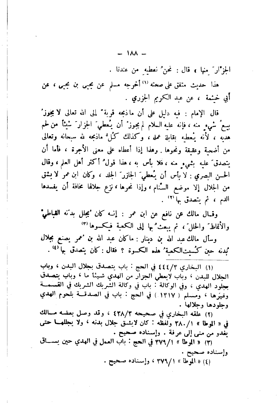 وَهَذَا إِذَا أَعْطَاهُ عَلَى مَعْنَى الْأُجْرَةِ، فَأَمَّا أَنْ يَتَصَدَّقَ عَلَيْهِ بِشَيْءٍ مِنْهُ، فَلا بَأْسَ بِهِ، هَذَا قَوْلُ أَكْثَرِ أَهْلِ الْعِلْمِ، وَقَالَ الْحَسَنُ الْبَصْرِيُّ: لَا بَأْسَ أَنْ يُعْطِيَ الْجَازِرَ الْجَلْدَ، وَكَانَ ابْنُ عُمَرَ لَا يَشُقُّ مِنَ الْجِلالِ إِلا مَوْضِعَ السَّنَامِ، وَإِذَا نَحَرَهَا، نَزَعَ جِلالَهَا مَخَافَةَ أَنْ يُفْسِدَهَا الدَّمُ، ثُمَّ يَتَصَدَّقُ بِهَا.