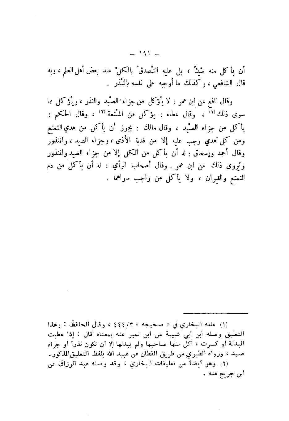 وَقَالَ نَافِعٌ، عَنِ ابْنِ عُمَرَ: لَا يُؤْكَلُ مِنْ جَزَاءِ الصَّيْدِ وَالنَّذْرِ، وَيُؤْكَلُ مِمَّا سِوَى ذَلِكَ، وَقَالَ عَطَاءٌ: يُؤْكَلُ مِنَ الْمُتْعَةِ، وَقَالَ الْحَكَمُ: يَأْكُلُ مِنْ جَزَاءِ الصَّيْدِ، وَقَالَ مَالِكٌ: يَجُوزُ أَنْ يَأْكُلَ مِنْ هَدْيِ التَّمَتُّعِ، وَمِنْ كُلِّ هَدْيٍ وَجَبَ عَلَيْهِ إِلا مِنْ فِدْيَةِ الْأَذَى، وَجَزَاءِ الصَّيْدِ، وَالْمَنْذُورِ.