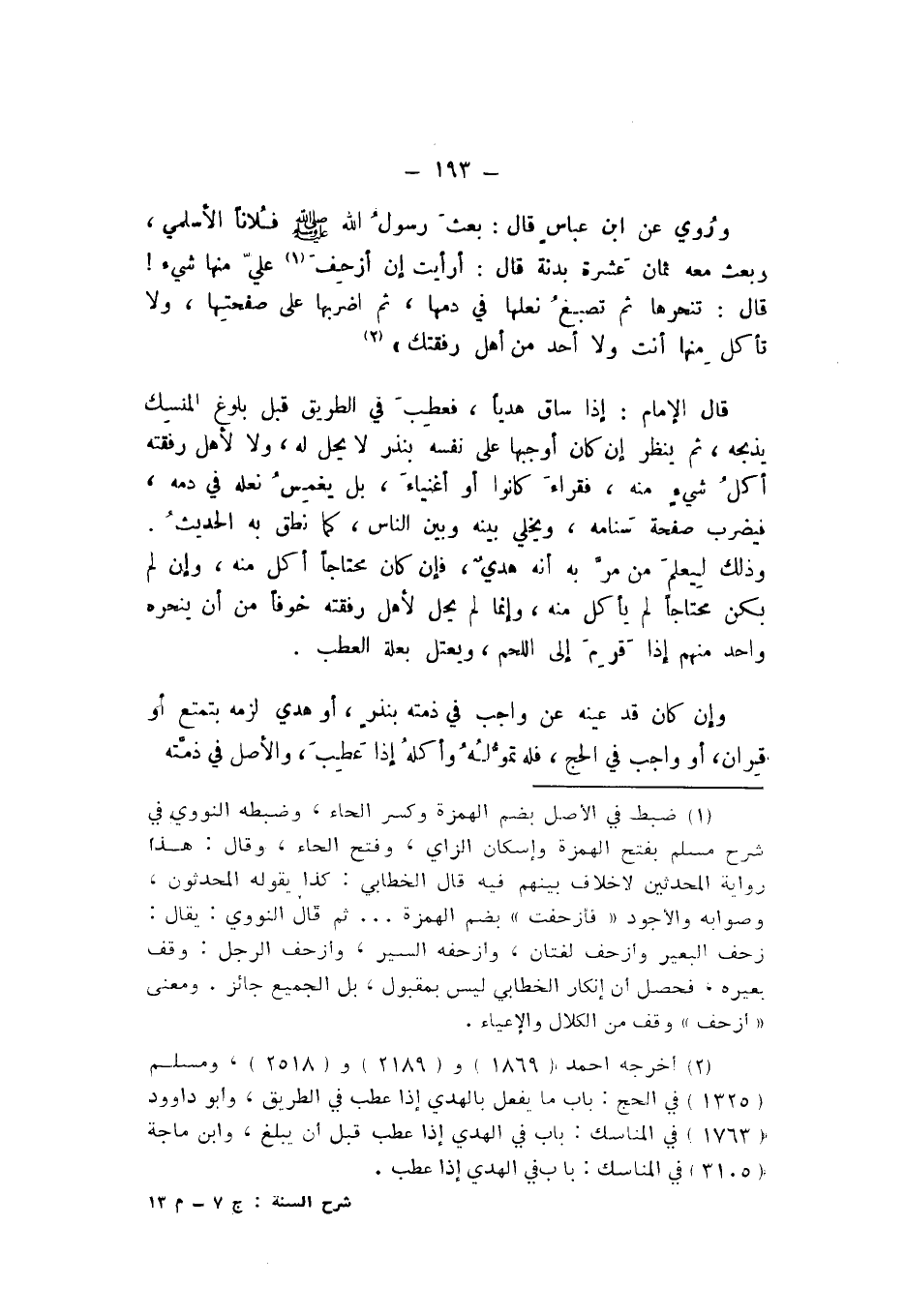 وَرُوِيَ عَنِ ابْنِ عَبَّاسٍ، قَالَ: بَعَثَ رَسُولُ اللَّهِ صَلَّى اللهُ عَلَيْهِ وَسَلَّمَ فُلانًا الْأَسْلَمِيَّ، وَبَعَثَ مَعَهُ ثَمَانِي عَشْرَةَ بَدَنَةً، قَالَ: أَرَأَيْتَ إِنْ أُزْحِفَ عَلَيَّ مِنْهَا شَيْءٌ! قَالَ: «تَنْحَرَهَا ثُمَّ تَصْبِغُ نَعْلَهَا فِي دَمِهَا، ثُمَّ اضْرِبْهَا عَلَى صَفْحَتِهَا، وَلا تَأْكُلْ مِنْهَا أَنْتَ وَلا أَحَدٌ مِنْ أَهْلِ رُفْقَتِكَ».
