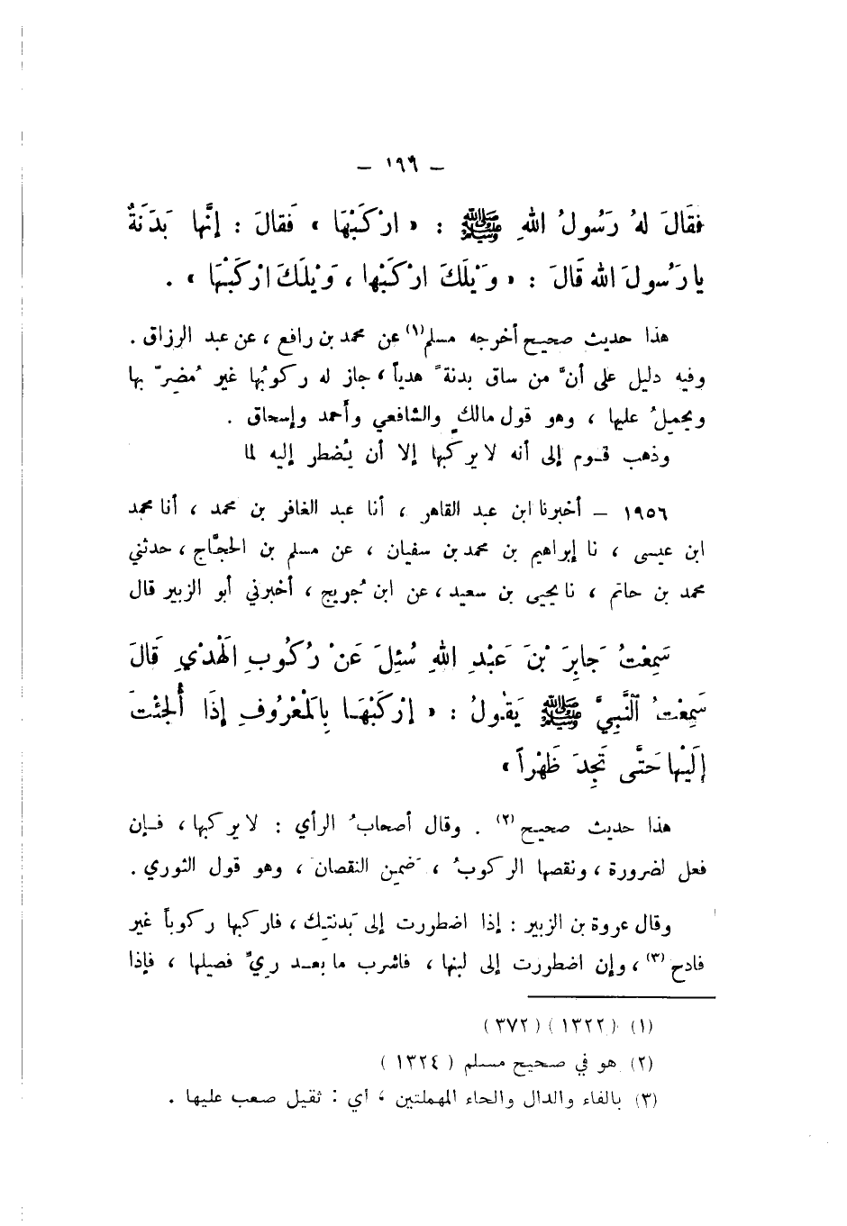 1956 - أَخْبَرَنَا ابْنُ عَبْدِ الْقَاهِرِ، أَنا عَبْدُ الْغَافِرِ بْنُ مُحَمَّدٍ، أَنا مُحَمَّدُ بْنُ عِيسَى، نَا إِبْرَاهِيمُ بْنُ مُحَمَّدِ بْنِ سُفْيَانَ، عَنْ مُسْلِمِ بْنِ الْحَجَّاجِ، حَدَّثَنِي مُحَمَّدُ بْنُ حَاتِمٍ، أَخْبَرَنَا يَحْيَى بْنُ سَعِيدٍ، عَنِ ابْنِ جُرَيْجٍ، أَخْبَرَنِي أَبُو الزُّبَيْرِ، قَالَ: سَمِعْتُ جَابِرَ بْنَ عبْدِ اللَّهِ، سُئِلَ عَنْ رُكُوبِ الْهَدْيِ، قَالَ: سَمِعْتُ النَّبِيَّ صَلَّى اللهُ عَلَيْهِ وَسَلَّمَ، يَقُولُ: «ارْكَبْهَا بِالْمَعْرُوفِ إِذَا أُلْجِئْتَ إِلَيْهَا حَتَّى تَجِدَ ظَهْرًا».