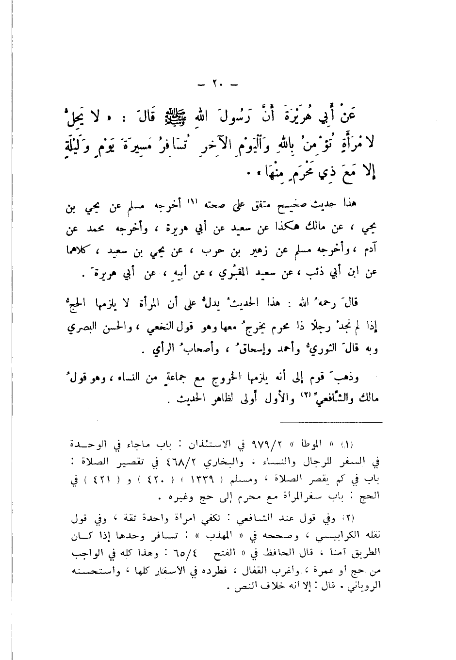 عَنْ أَبِي هُرَيْرَةَ، أَنّ رَسُولَ اللَّهِ صَلَّى اللهُ عَلَيْهِ وَسَلَّمَ، قَالَ: «لَا يَحِلُّ لامْرَأَةٍ تُؤْمِنُ بِاللَّهِ وَالْيَوْمِ الْآخِرِ تُسَافِرُ مَسِيرَةَ يَوْمٍ وَلَيْلَةٍ إِلا مَعَ ذِي مَحْرَمٍ مِنْهَا».