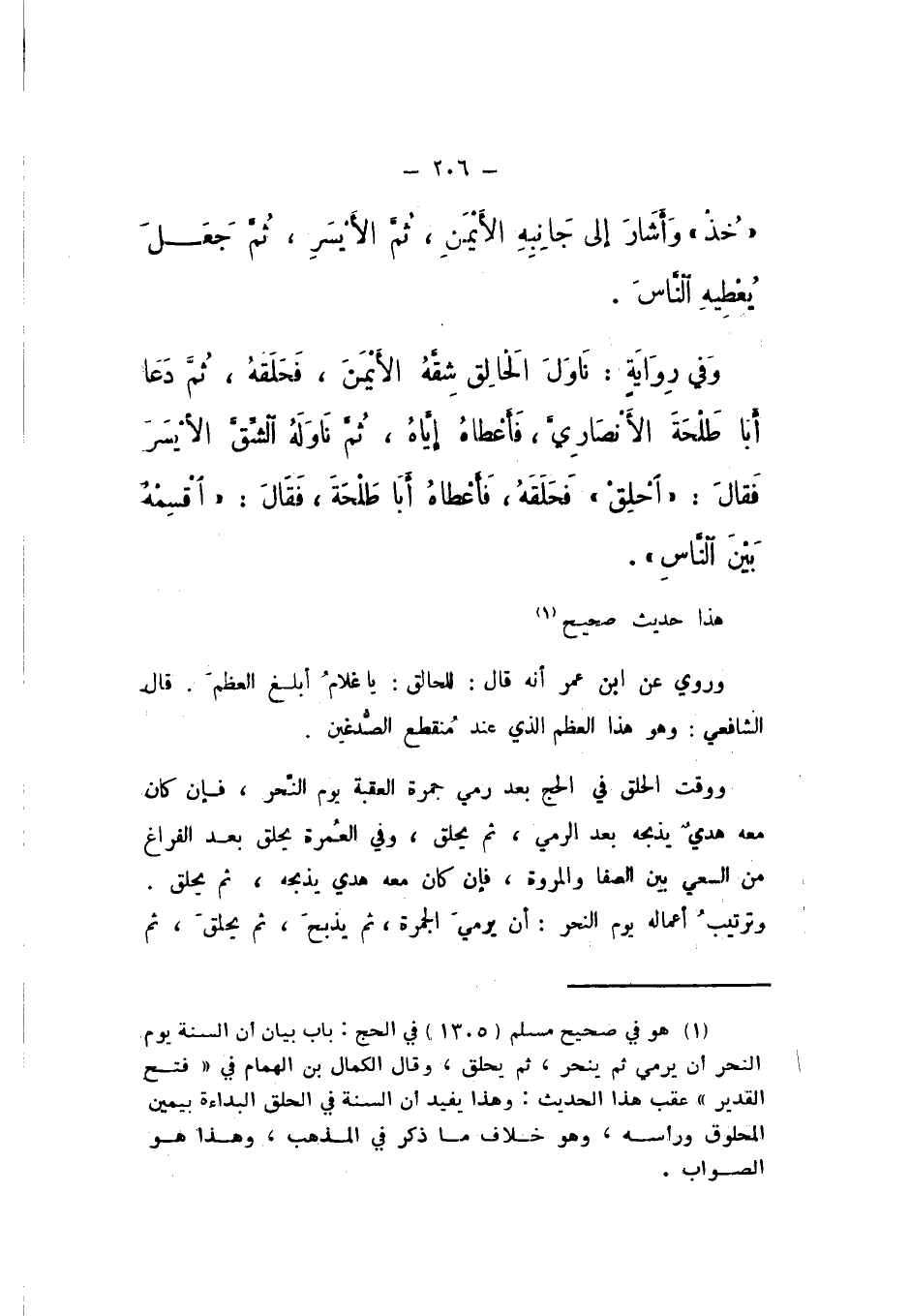 وَفِي رِوَايَةٍ: نَاوَلَ الْحَالِقَ شِقَّهُ الْأَيْمَنَ، فَحَلَقَهُ، ثُمَّ دَعَا أَبَا طَلْحَةَ الْأَنْصَارِيَّ، فَأَعْطَاهُ إِيَّاهُ، ثُمَّ نَاوَلَهُ الشِّقَّ الْأَيْسَرَ، فَقَالَ: «احْلِقْ»، فَحَلَقَهُ، فَأَعْطَاهُ أَبَا طَلْحَةَ، فَقَالَ: «اقْسِمْهُ بَيْنَ النَّاسِ».