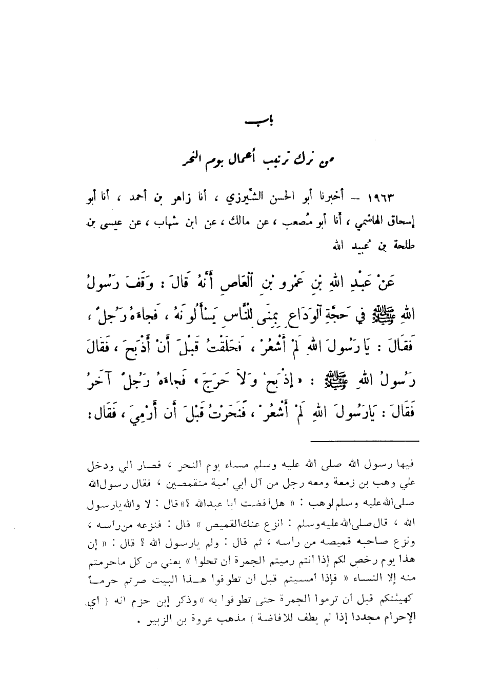 1963 - أَخْبَرَنَا أَبُو الْحَسَنِ الشِّيرَزِيُّ، أَنا زَاهِرُ بْنُ أَحْمَدَ، أَنا أَبُو إِسْحَاقَ الْهَاشِمِيُّ، أَنا أَبُو مُصْعَبٍ، عَنْ مَالِكٍ، عَنِ ابْنِ شِهَابٍ، عَنْ عِيسَى بْنِ طَلْحَةَ بْنِ عُبَيْدٍ اللَّهِ، عَنْ عَبْدِ اللَّهِ بْنِ عَمْرِو بْنِ الْعَاصِ، أَنَّهُ قَالَ: وَقَفَ رَسُولُ اللَّهِ صَلَّى اللهُ عَلَيْهِ وَسَلَّمَ فِي حَجَّةِ الْوَدَاعِ بِمِنًى لِلنَّاسِ يَسْألُونَهُ، فَجَاءَهُ رَجُلٌ، فَقَالَ: يَا رَسُولَ اللَّهِ، لَمْ أَشْعُرْ، فَحَلقْتُ قَبْلَ أَنْ أَذْبَحَ، فَقَالَ رَسُولُ اللَّهِ صَلَّى اللهُ عَلَيْهِ وَسَلَّمَ: «اذْبَحْ وَلا حَرَجَ»، فَجَاءَهُ رَجُلٌ آخَرُ، فَقَالَ: يَا رَسُولَ اللَّهِ، لَمْ أَشْعُرْ، فَنَحَرْتُ قَبْلَ أَنْ أَرْمِيَ، فَقَالَ: «