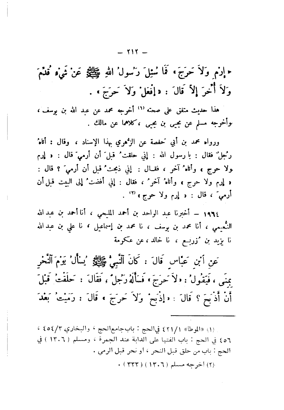 1964 - أَخْبَرَنَا عَبْدُ الْوَاحِدِ بْنُ أَحْمَدَ الْمَلِيحِيُّ، أَنا أَحْمَدُ بْنُ عَبْدِ اللَّهِ النُّعَيْمِيُّ، أَنا مُحَمَّدُ بْنُ يُوسُفَ، نَا مُحَمَّدُ بْنُ إِسْمَاعِيلَ، نَا عَلِيُّ بْنُ عَبْدِ اللَّهِ، نَا يَزِيدُ بْنُ زُرَيْعٍ، نَا خَالِدٌ، عَنْ عِكْرِمَةَ، عَنِ ابْنِ عَبَّاسٍ، قَالَ: كَانَ النَّبِيُّ صَلَّى اللهُ عَلَيْهِ وَسَلَّمَ يُسْأَلُ يَوْمَ النَّحْرِ بِمِنًى، فَيَقُولُ: «لَا حَرَجَ»، فَسَأَلَهُ رَجُلٌ، فَقَالَ: حَلَقْتُ قَبْلَ أَنْ أَذْبَحَ؟ قَالَ: «اذْبَحْ وَلا حَرَجَ»، قَالَ: رَمَيْتُ بَعْدَ