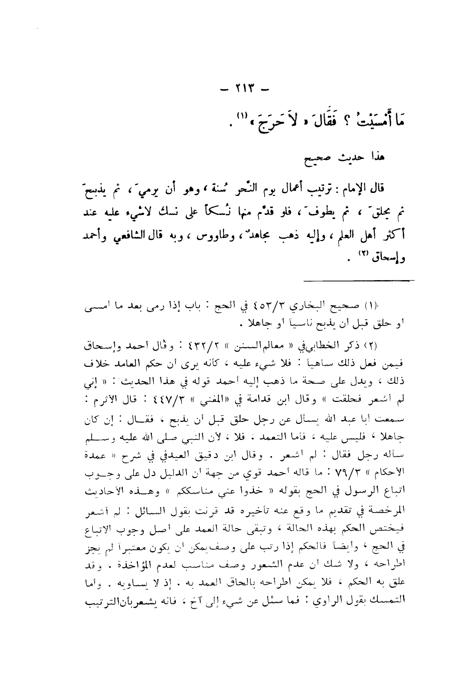 قَالَ الإِمَامُ: تَرْتِيبُ أَعْمَالِ يَوْمِ النَّحْرِ سُنَّةٌ، وَهُوَ أَنْ يَرْمِيَ، ثُمَّ يَذْبَحَ، ثُمَّ يَحْلِقَ، ثُمَّ يَطُوفَ، فَلَوْ قَدَّمَ مِنْهَا نُسُكًا عَلَى نُسُكٍ، لَا شَيْءَ عَلَيْهِ عِنْدَ أَكْثَرِ أَهْلِ الْعِلْمِ، وَإِلَيْهِ ذَهَبَ مُجَاهِدٌ، وَطَاوُسٌ، وَبِهِ قَالَ الشَّافِعِيُّ، وَأَحْمَدُ، وَإِسْحَاقُ.