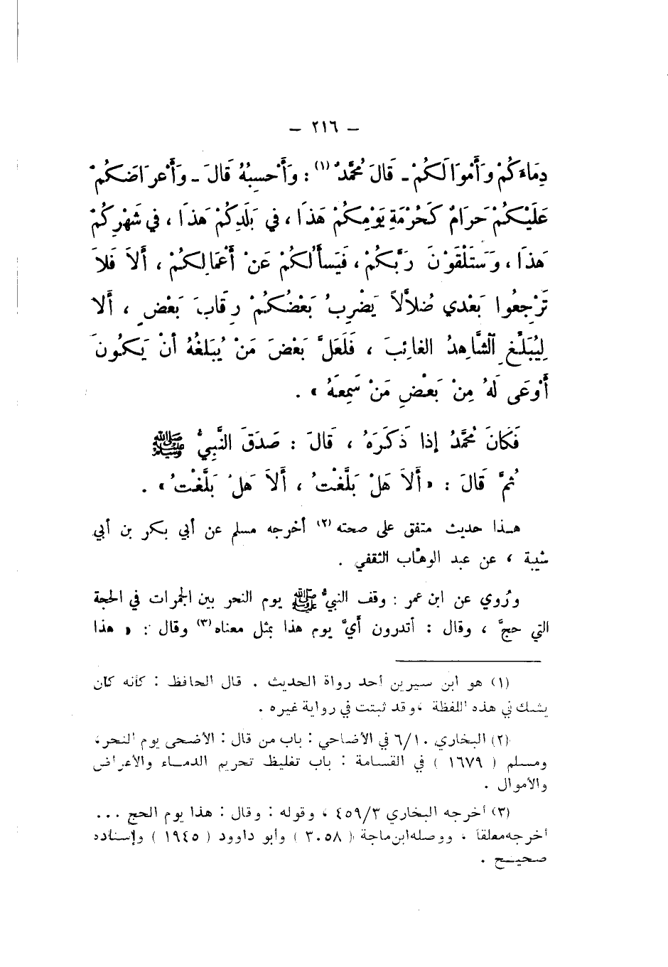دِمَاءَكُمْ وَأَمْوَالَكُمْ»، قَالَ مُحَمَّدٌ: وَأَحْسِبُهُ قَالَ: «وَأَعْرَاضَكُمْ عَلَيْكُمْ حَرَامٌ، كَحُرْمَةِ يَوْمِكُمْ هَذَا، فِي بَلَدِكُمْ هَذَا، فِي شَهْرِكُمْ هَذَا، وسَتَلْقَوْنَ رَبَّكُمْ، فَيَسْأَلُكُم ْ عَنْ أَعْمَالِكُمْ، أَلا فَلا تَرْجِعُوا بَعْدِي ضُلالًا، يَضْرِبُ بَعْضُكُمْ رِقَابَ بَعْضٍ، أَلا لِيُبَلِّغِ الشَّاهِدُ الْغَائِبَ، فَلَعَلَّ بَعْضَ مَنْ يُبَلِّغُهُ أنْ يَكُونَ أَوْعَى لَهُ مِنْ بَعْضِ مَنْ سَمِعَهُ».