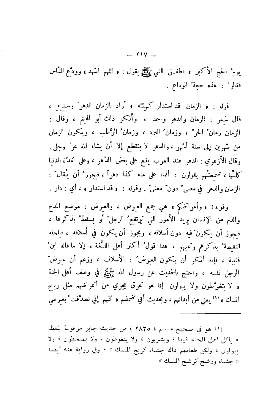 قَوْلُهُ: «الزَّمَانُ قَدِ اسْتَدَارَ كَهَيْئَتِهِ»، أَرَادَ بِالزَّمَانِ الدَّهْرَ وَسِنِيهِ، قَالَ شِمْرٌ: الزَّمَانُ وَالدَّهْرُ وَاحِدٌ، وَأَنْكَرَ ذَلِكَ أَبُو الْهَيْثَمِ، وَقَالَ: الزَّمَانُ زَمَانُ الْحَرِّ، وَزَمَانُ الْبَرْدِ، وَزَمَانُ الرُّطَبِ، وَيَكُونُ الزَّمَانُ مِنْ شَهْرَيْنِ إِلَى سِتَّةِ أَشْهُرٍ، وَالدَّهْرُ لَا يَنْقَطِعُ إِلا أَنْ يَشَاءَ اللَّهُ عَزَّ وَجَلَّ.