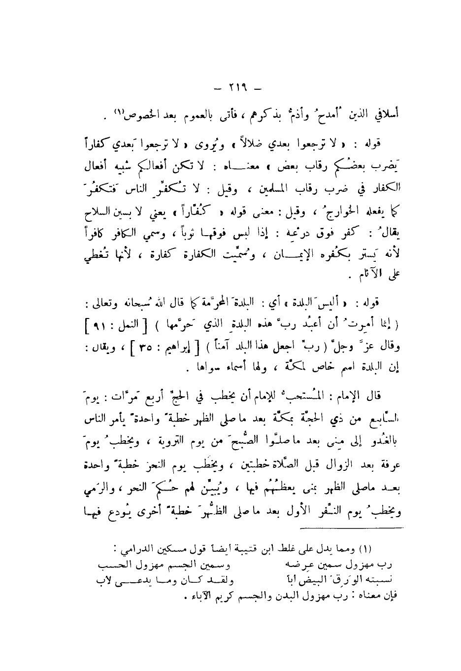 قَوْلُهُ: «لَا تَرْجِعُوا بَعْدِي ضُلالا»، وَيُرْوَى: «لَا تَرْجِعُوا بَعْدِي كُفَّارًا يَضْرِبُ بَعْضُكُمْ رِقَابَ بَعْضٍ»، مَعْنَاهُ: لَا تَكُنْ أَفْعَالُكُمْ شَبِيهَ أَفْعَالِ الْكُفَّارِ فِي ضَرْبِ رِقَابِ الْمُسْلِمِينَ، وَقِيلَ: لَا تُكَفِّرِ النَّاسَ، فَتَكْفُرَ كَمَا يَفْعَلُهُ الْخَوَارِجُ، وَقِيلَ: مَعْنَى قَوْلِهِ: «كُفَّارًا»، يَعْنِي لابِسِينَ السِّلاحَ، يُقَالُ: كَفَّرَ فَوْقَ دِرْعِهِ: إِذَا لَبِسَ فَوْقَهَا ثَوْبًا، وَسُمِّيَ الْكَافِرُ كَافِرًا، لِأَنَّهُ يَسْتُرُ بِكُفْرِهِ الإِيمَانَ، وَسُمِّيَتِ الْكَفَّارَةُ كَفَّارَةً، لِأَنَّهَا تُغَطِّي عَلَى الْآثَامِ.
