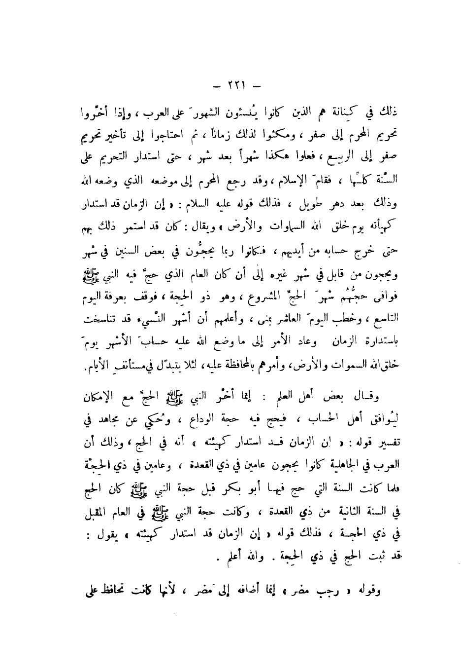 ذَلِكَ فِي كِنَانَةَ هُمُ الَّذِينَ كَانُوا يُنْسِئُونَ الشُّهُورَ عَلَى الْعَرَبِ، وَإِذَا أَخَّرُوا تَحْرِيمَ الْمُحَرَّمِ إِلَى صَفَرٍ، وَمَكَثُوا لِذَلِكَ زَمَانًا، ثُمَّ احْتَاجُوا إِلَى تَأْخِيرِ تَحْرِيمِ صَفَرٍ إِلَى الرَّبِيعِ، فَعَلُوا هَكَذَا شَهْرًا بَعْدَ شَهْرٍ، حَتَّى اسْتَدَارَ التَّحْرِيمُ عَلَى السَّنَةِ كُلِّهَا، فَقَامَ الإِسْلامُ، وَقَدْ رَجَعَ الْمُحَرَّمِ إِلَى مَوْضِعِهِ الَّذِي وَضَعَهُ اللَّهُ، وَذَلِكَ بَعْدَ دَهْرٍ طَوِيلٍ، فَذَلِكَ قَوْلُهُ عَلَيْهِ السَّلامُ: «إِنَّ الزَّمَانَ قَدِ اسْتَدَارَ كَهَيْئَتِهِ يَوْمَ خَلَقَ اللَّهُ السَّمَوَاتِ وَالْأَرْضَ»، وَيُقَالُ: كَانَ قَدِ اسْتَمَرَّ ذَلِكَ بِهِمْ حَتَّى خَرَجَ حِسَابُهُ مِنْ أَيْدِيهِمْ، فَكَانُوا رُبَّمَا يَحُجُّونَ فِي بَعْضِ السِّنِينَ فِي شَهْرٍ، وَيَحُجُّونَ مِنْ قَابِلٍ فِي شَهْرٍ غَيْرِهِ، إِلَى أَنْ كَانَ الْعَامُ الَّذِي حَجَّ فِيهِ النَّبِيُّ صَلَّى اللهُ عَلَيْهِ وَسَلَّمَ، فَوَافَى حَجُّهُمْ شَهْرَ الْحَجِّ الْمَشْرُوعِ، وَهُوَ ذُو الْحِجَّةِ، فَوَقَفَ بِعَرَفَةَ الْيَوْمَ التَّاسِعَ، وَخَطَبَ الْيَوْمَ الْعَاشِرَ بِمِنًى، وَأَعْلَمَهُمْ أَنَّ أَشْهُرَ النَّسِيءِ قَدْ تَنَاسَخَتْ بِاسْتِدَارَةِ الزَّمَانِ، وَعَادَ الْأَمْرُ إِلَى مَا وَضَعَ اللَّهُ عَلَيْهِ حِسَابَ الْأَشْهُرِ يَوْمَ خَلَقَ اللَّهُ السَّمَوَاتِ وَالْأَرْضَ، وَأَمَرَهُمْ بِالْمُحَافَظَةِ عَلَيْهِ، لِئَلا يَتَبَدَّلَ فِي مُسْتَأْنَفِ الْأَيَّامِ.