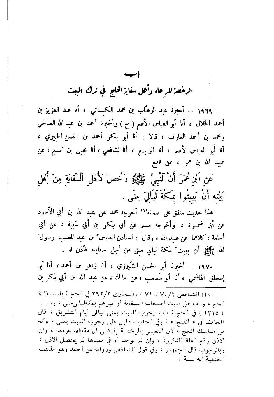 حَ وَأَخْبَرَنَا أَحْمَدُ بْنُ عَبْدِ اللَّهِ الصَّالِحِيُّ، وَمُحَمَّدُ بْنُ أَحْمَدَ الْعَارِفُ، قَالا: أَنا أَبُو بَكْرٍ أَحْمَدُ بْنُ الْحَسَنِ الْحِيرِيُّ، أَنا أَبُو الْعَبَّاسِ الْأَصَمُّ، أَنا الرَّبِيعُ، أَنا الشَّافِعِيُّ، أَنا يَحْيَى بْنُ سُلَيْمٍ، عَنْ عُبَيْدِ اللَّهِ بْنِ عُمَرَ، عَنْ نَافِعٍ، عَنِ ابْنِ عُمَرَ، أَنّ النَّبِيَّ صَلَّى اللهُ عَلَيْهِ وَسَلَّمَ «رَخَّصَ لِأَهْلِ السِّقَايَةِ مِنْ أَهْلِ بَيْتِهِ أَنْ يَبِيتُوا بِمَكَّةَ لَيَالِي مِنًى».