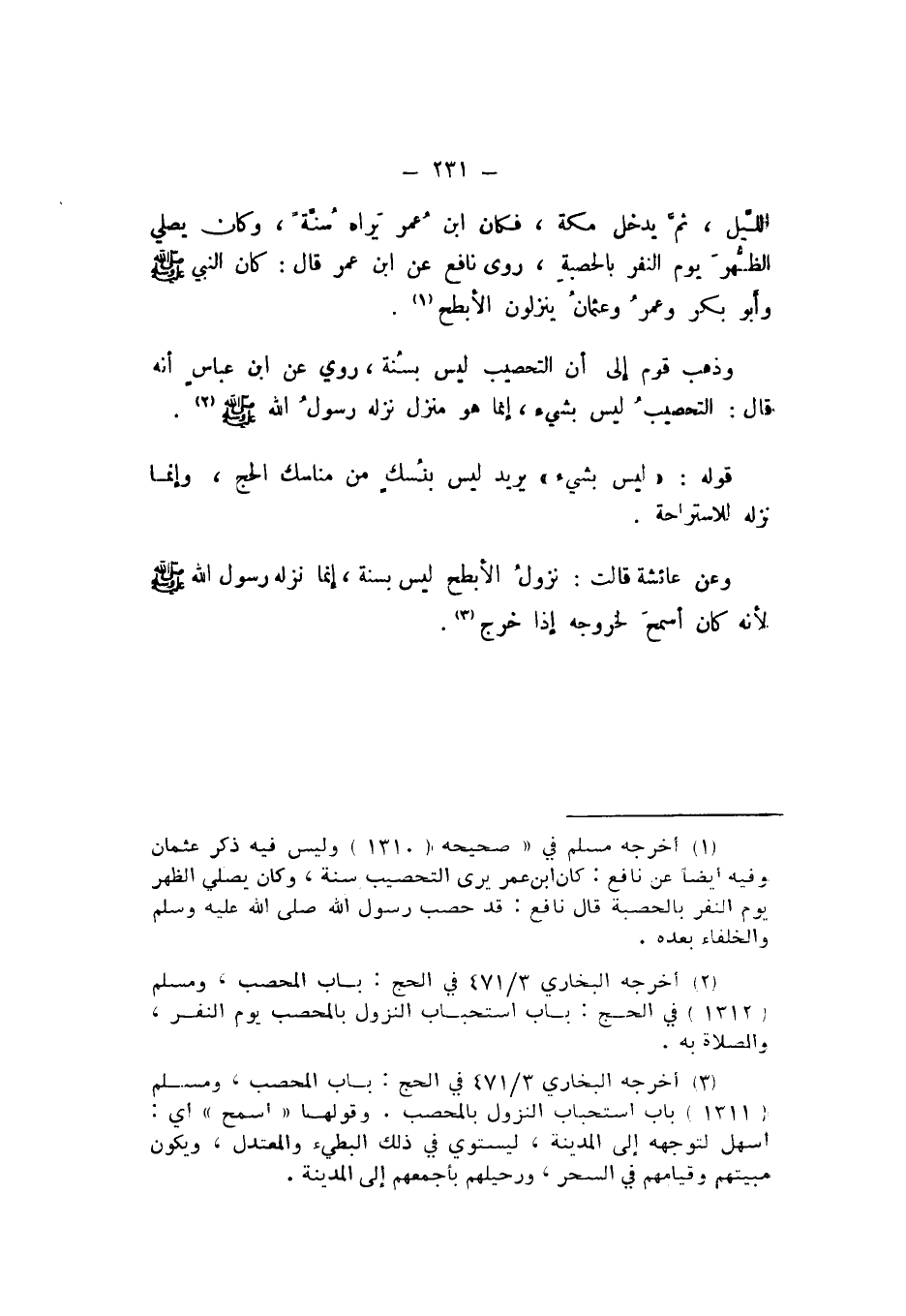 اللَّيْلِ، ثُمَّ يَدْخُلُ مَكَّةَ، فَكَانَ ابْنُ عُمَرَ يَرَاهُ سُنَّةً، وَكَانَ يُصَلِّي الظُّهْرَ يَوْمَ النَّفْرِ بِالْحَصْبَةِ، وَرَوَى نَافِعٌ، عَنِ ابْنِ عُمَرَ، قَالَ: كَانَ النَّبِيُّ صَلَّى اللهُ عَلَيْهِ وَسَلَّمَ وَأَبُو بَكْرٍ، وَعُمَرُ وَعُثْمَانُ يَنْزِلُونَ الْأَبْطَحَ.