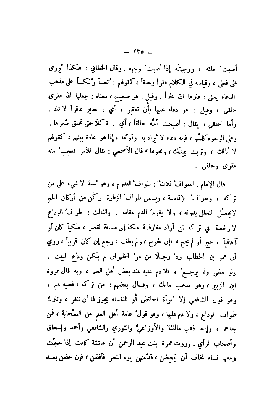 وَأَمَّا حَلْقَى، يُقَالُ: أَصْبَحَتْ أُمُّهُ حَالِقًا، أَيْ: ثَاكِلًا حَتَّى تَحْلِقَ شَعْرَهَا.