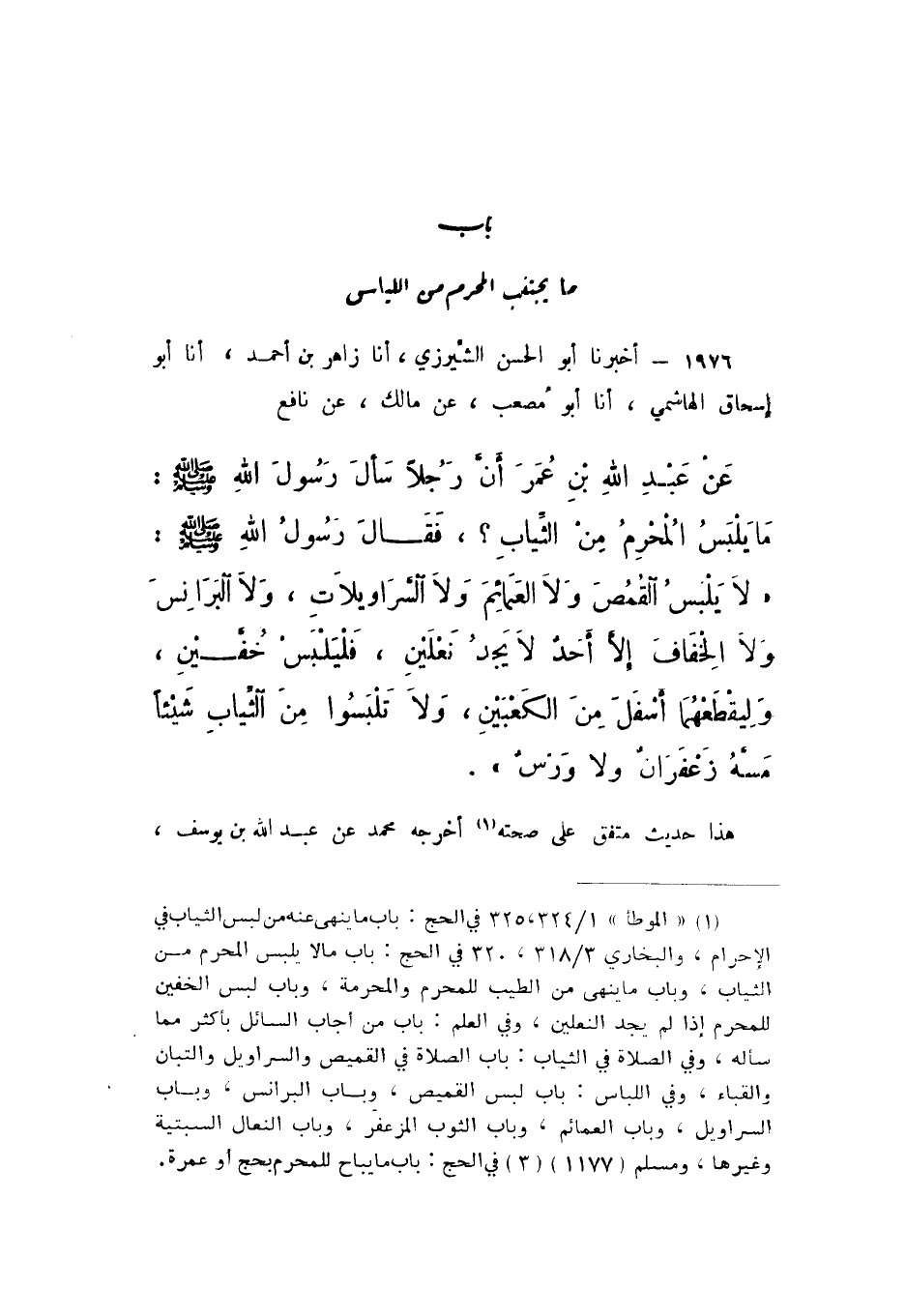 1975 - أَخْبَرَنَا أَبُو الْحَسَنِ الشِّيرَزِيُّ، أَنا زَاهِرُ بْنُ أَحْمَدَ، أَنا أَبُو إِسْحَاقَ الْهَاشِمِيُّ، أَنا أَبُو مُصْعَبٍ، عَنْ مَالِكٍ، عَنْ نَافِعٍ، عَنْ عَبْدِ اللَّهِ بْنِ عُمَرَ، أَنَّ رَجُلا سَأَلَ رَسُولَ اللَّهِ صَلَّى اللهُ عَلَيْهِ وَسَلَّمَ: مَا يَلْبَسُ الْمُحْرِمُ مِنَ الثِّيَابِ؟، فَقَالَ رَسُولُ اللَّهِ صَلَّى اللهُ عَلَيْهِ وَسَلَّمَ: «لَا يَلْبَسُ الْقُمُصَ، وَلا الْعَمَائِمَ، وَلا السَّرَاوِيلاتِ، وَلا الْبَرَانِسَ، وَلا الْخِفَافَ، إِلا أَحَدٌ لَا يَجِدُ نَعْلَيْنِ، فَلْيَلْبَسْ خُفَّيْنِ، وَلْيَقْطَعْهُمَا أَسْفَلَ مِنَ الْكَعْبَيْنِ، وَلا تَلْبَسُوا مِنَ الثِّيَابِ شَيْئًا مَسَّهُ زَعْفَرَانٌ وَلا وَرْسٌ».