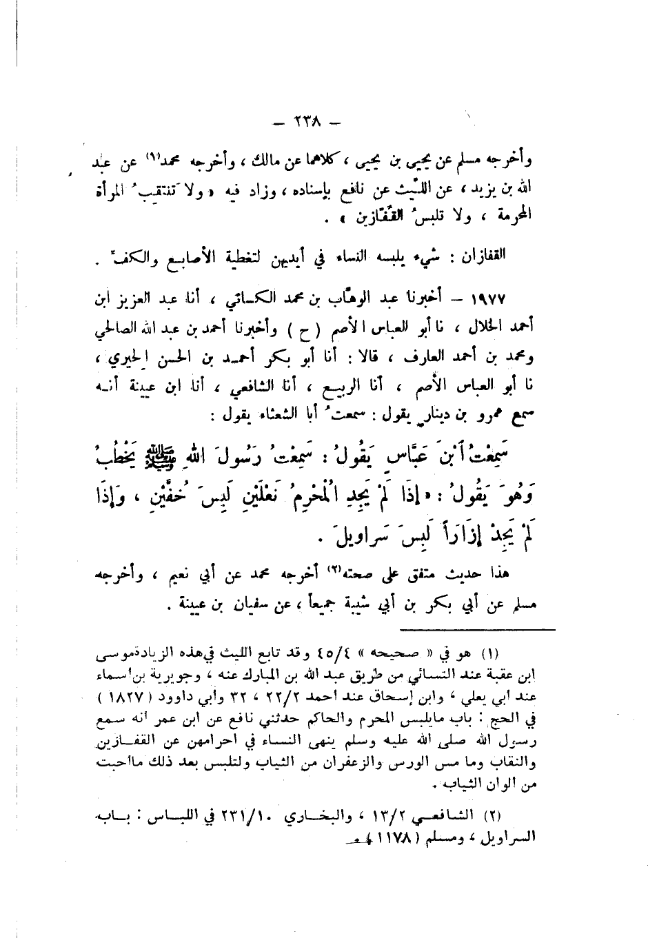 حَ وَأَخْبَرَنَا أَحْمَدُ بْنُ عَبْدِ اللَّهِ الصَّالِحِيُّ، وَمُحَمَّدُ بْنُ أَحْمَدَ الْعَارِفُ، قَالا: أَنا أَبُو بَكْرٍ أَحْمَدُ بْنُ الْحَسَنِ الْحِيرِيُّ، نَا أَبُو الْعَبَّاسِ الْأَصَمُّ، أَنا الرَّبِيعُ، أَنا الشَّافِعِيُّ، أَنا ابْنُ عُيَيْنَةَ، أَنَّهُ سَمِعَ عَمْرَو بْنَ دِينَارٍ، يَقُولُ: سَمِعْتُ أَبَا الشَّعْثَاءِ، يَقُولُ: سَمِعْتُ ابْنَ عَبَّاسٍ، يَقُولُ: سَمِعْتُ رَسُولَ اللَّهِ صَلَّى اللهُ عَلَيْهِ وَسَلَّمَ، يَخْطُبُ وَهُوَ يَقُولُ: «إِذَا لَمْ يَجِدِ الْمُحْرِمُ نَعْلَيْنِ لَبِسَ خُفَّيْنِ، وَإِذَا لَمْ يَجِدْ إِزَارًا لَبِسَ سَرَاوِيلَ».