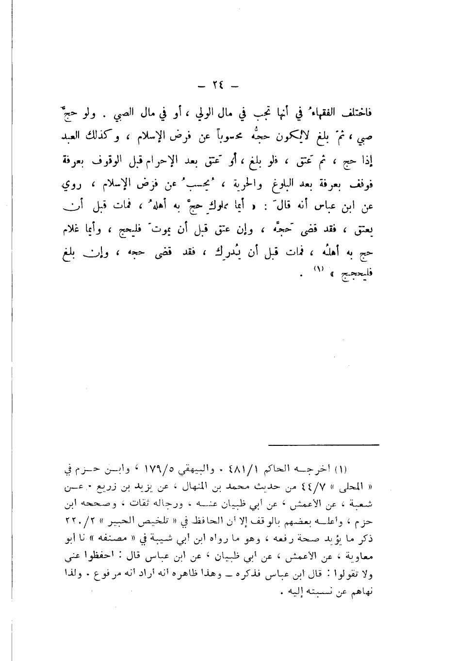 وَلَوْ حَجَّ صَبِيٌّ، ثُمَّ بَلَغَ، لَا يَكُونُ حَجُّهُ مَحْسُوبًا عَنْ فَرْضِ الإِسْلامِ، وَكَذَلِكَ الْعَبْدُ إِذَا حَجَّ، ثُمَّ عُتِقَ، فَلَوْ بَلَغَ، أَوْ عُتِقَ بَعْدَ الإِحْرَامِ قَبْلَ الْوُقُوفِ بِعَرَفَةَ فَوَقَفَ بِعَرَفَةَ بَعْدَ الْبُلُوغِ وَالْحُرِّيَّةِ، يُحْسَبُ عَنْ فَرْضِ الإِسْلامِ، رُوِيَ عَنِ ابْنِ عَبَّاسٍ أَنَّهُ قَالَ: أَيُّمَا مَمْلُوكٍ حَجَّ بِهِ أَهْلُهُ، فَمَاتَ قَبْلَ أَنْ يُعْتَقَ، فَقَدْ قَضَى حَجَّهُ، وَإِنْ عُتِقَ قَبْلَ أَنْ يَمُوتَ، فَلْيَحُجَّ، وَأَيُّمَا غُلامٍ حَجَّ بِهِ أَهْلُهُ فَمَاتَ قَبْلَ أَنْ يُدْرِكَ، فَقَدْ قَضَى حَجَّهُ، وَإِنْ بَلَغَ فَلْيَحْجُجْ ".
