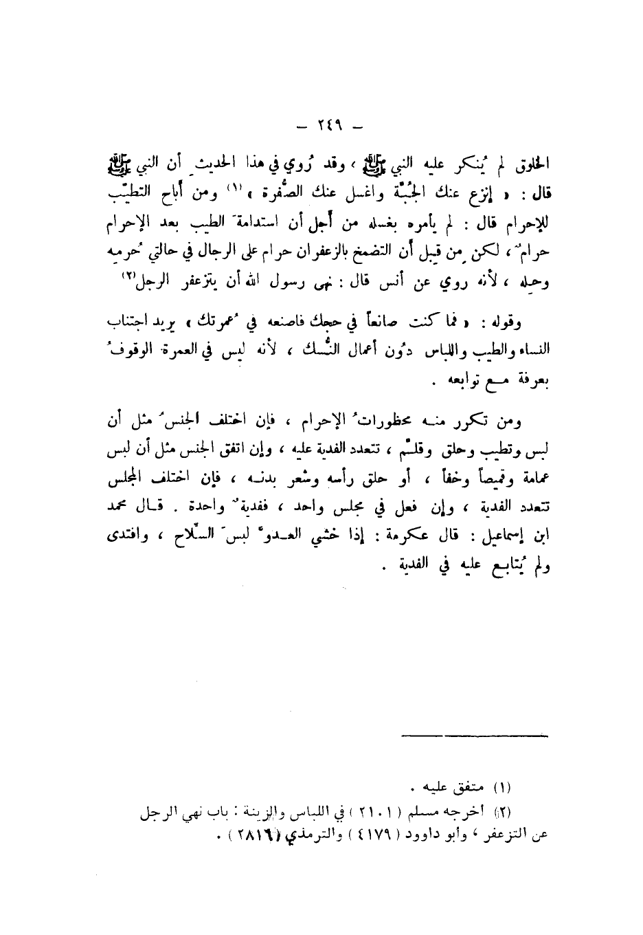 الْخَلُوقِ، لَمْ يُنْكِرْ عَلَيْهِ النَّبِيُّ صَلَّى اللهُ عَلَيْهِ وَسَلَّمَ، وَقَدْ رُوِيَ فِي هَذَا الْحَدِيثِ أَنَّ النَّبِيَّ صَلَّى اللهُ عَلَيْهِ وَسَلَّمَ، قَالَ: «انْزَعْ عَنْكَ الْجُبَّةَ، وَاغْسِلْ عَنْكَ الصُّفْرَةَ»، وَمَنْ أَبَاحَ التَّطَيُّبَ لِلْإِحْرَامِ، قَالَ: لَمْ يَأْمُرْهُ بِغَسْلِهِ مِنْ أَجْلِ أَنَّ اسْتِدَامَةَ الطِّيبِ بَعْدَ الإِحْرَامِ حَرَامٌ، لَكِنْ مِنْ قِبَلِ أَنَّ التَّضَمُّخَ بِالزَّعْفَرَانِ حَرَامٌ عَلَى الرِّجَالِ فِي حَالَتَيْ حُرْمِهِ وَحِلِّهِ، لِأَنَّهُ رُوِيَ عَنْ أَنَسٍ، قَالَ: نَهَى رَسُولُ اللَّهِ أَنْ يَتَزَعْفَرَ الرَّجُلُ.