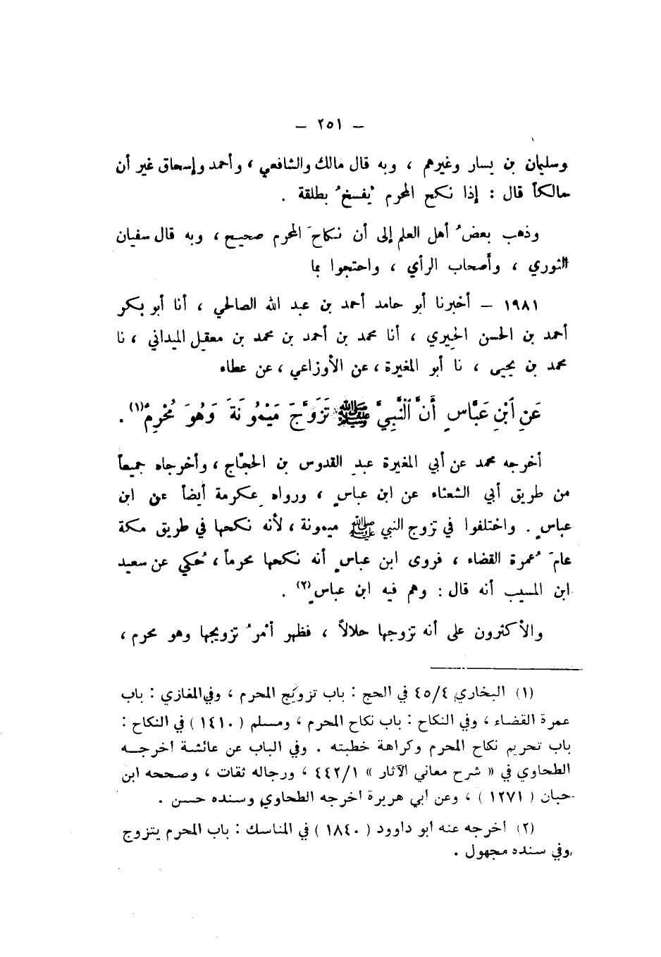 1980 - أَخْبَرَنَا أَبُو حَامِدٍ أَحْمَدُ بْنُ عَبْدِ اللَّهِ الصَّالِحِيُّ، أَنا أَبُو بَكْرٍ أَحْمَدُ بْنُ الْحَسَنِ الْحِيرِيُّ، أَنا مُحَمَّدُ بْنُ أَحْمَدَ بْنِ مُحَمَّدِ بْنِ مَعْقِلٍ الْمَيْدَانِيُّ، نَا مُحَمَّدُ بْنُ يَحْيَى، نَا الْمُغِيرَةُ، عَنِ الْأَوْزَاعِيِّ، عَنْ عَطَاءٍ، عَنِ ابْنِ عَبَّاسٍ، أَنّ النَّبِيَّ صَلَّى اللهُ عَلَيْهِ وَسَلَّمَ «تَزَوَّجَ مَيْمُونَةَ وَهُوَ مُحْرِمٌ».